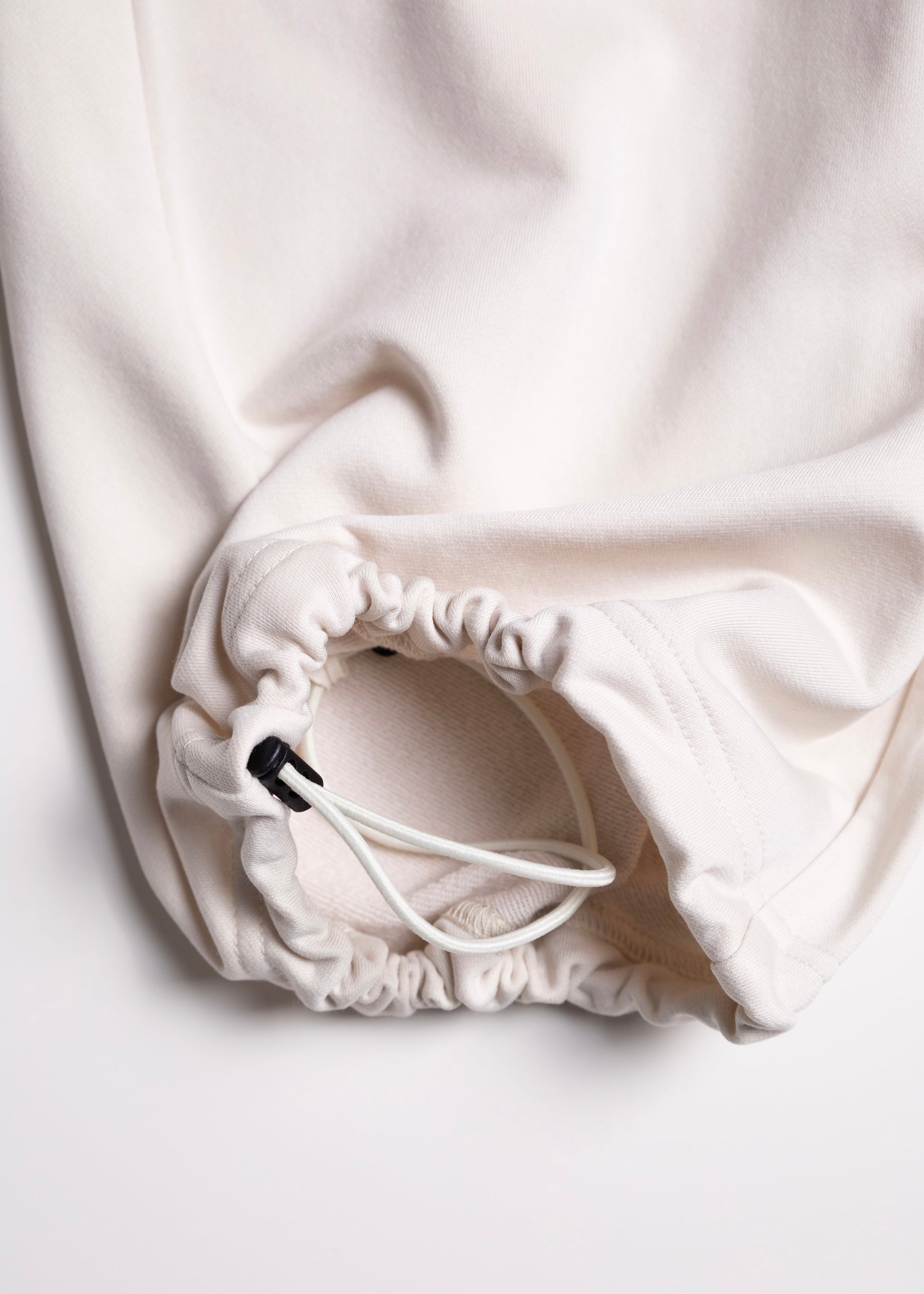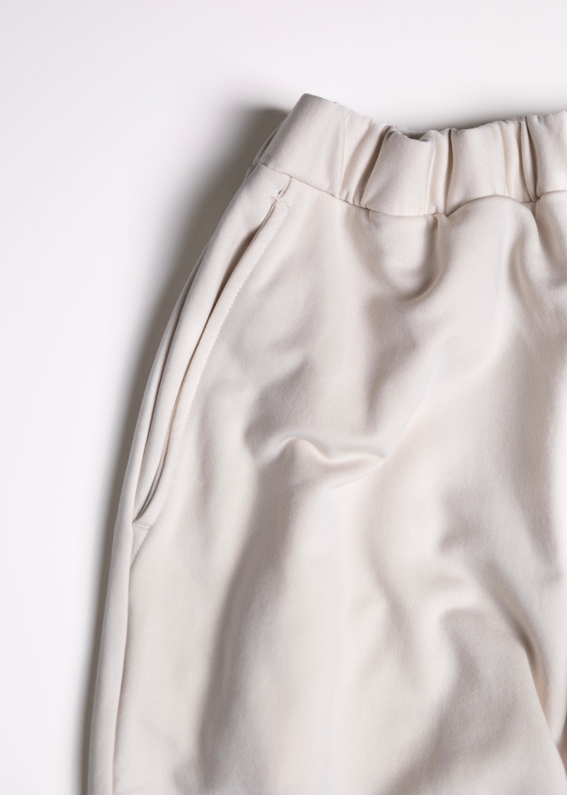 新しい価値観のある裏毛素材。25SSに発売し、ご好評頂いたキュプラ裏毛。独自の光沢感を風合いは、KANEMASA PHIL.の新定番。 大好きな素材をふんだんに使った程よいワイドパンツ。 ノータックで絞った時の生地のたまりなど最高です。 28G高密度裏毛機で度詰めに編立てた新裏毛素材。表糸に105D高収縮キュプラ糸を使用。生地加工で、フィブリル加工(繊維の中の小さな繊維、を摩擦させ、表面を毛羽立たせる加工)することで 独特な光沢感と、ヌメリ感がございます。肌面には、スビンコットン双糸を使用してさらっとした着心地がございます。 触ったことのないとろみが特徴です。スウェットと天竺の間の肉感にて、オールシーズン着用頂けます。 ワタリからストンと落としたストレートシルエットのワイドパンツ。 裾にドローコードを入れることで様々なシルエットで着用頂けます。 ウエストや裾を絞った際の生地のたまりなどが綺麗に出るように素材を最大限に活かしたディティールにしております。