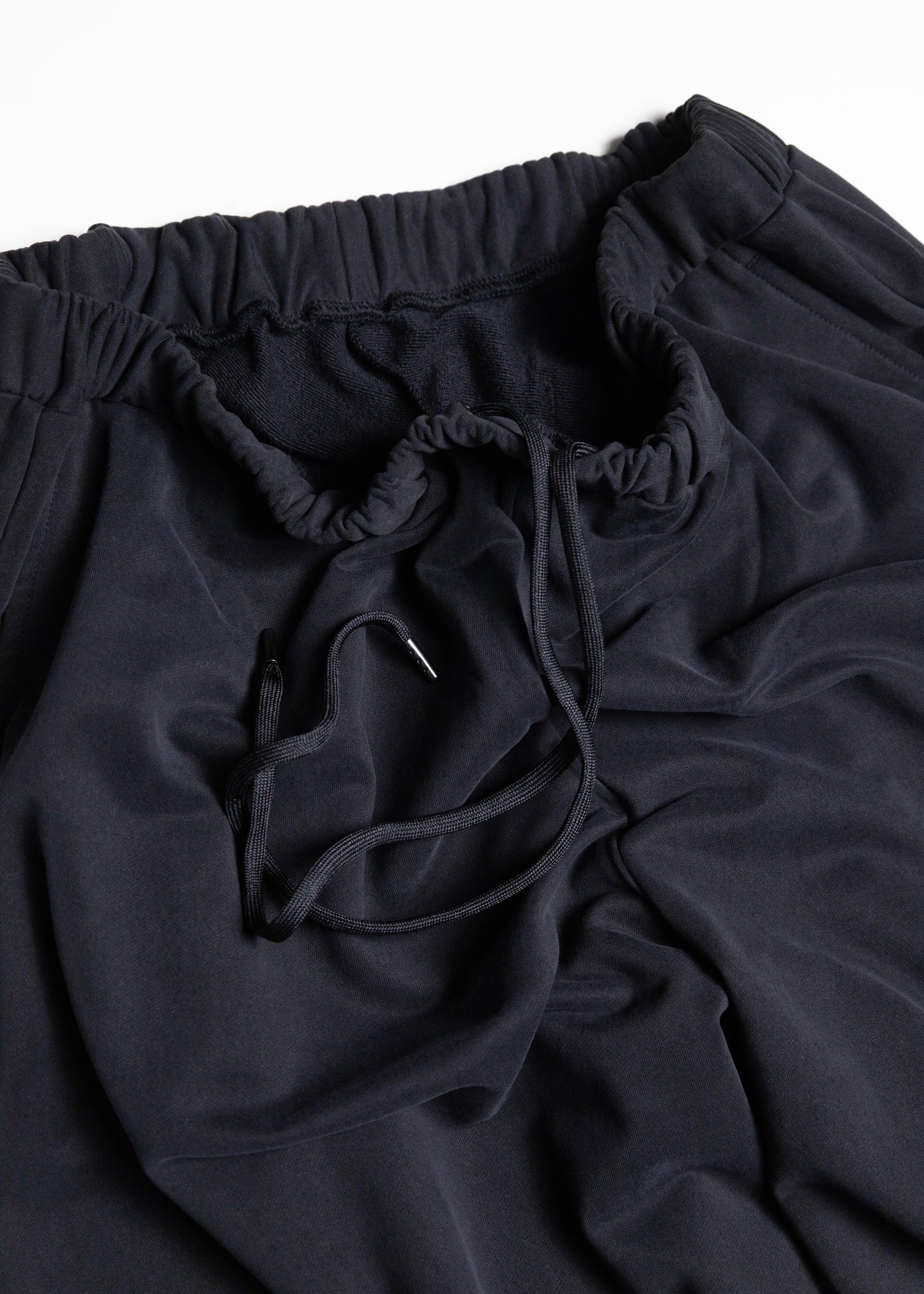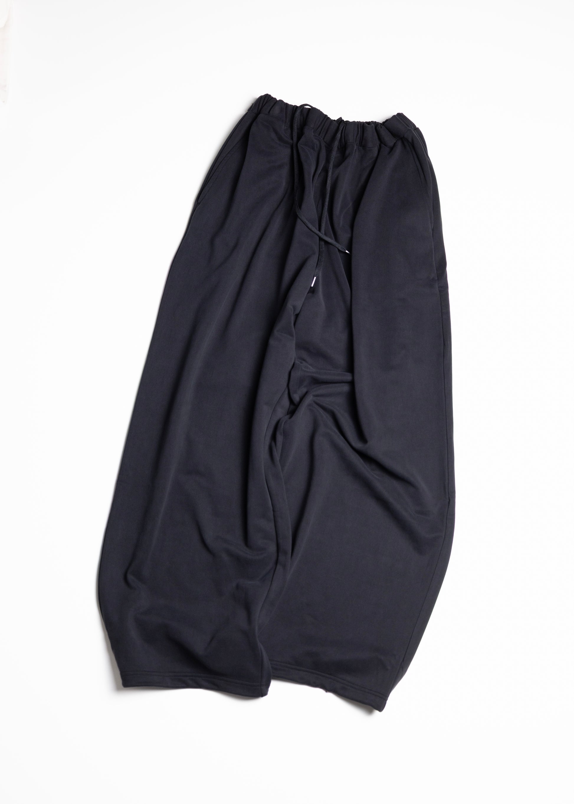 25SS に発売し、ご好評頂いたキュプラ裏毛。独自の光沢感を風合いは、KANEMASAPHIL.の新定番。フライス始末でより着用しやすいように仕上げました。結局こういうの一番着用します。ヌメヌメながらオチ感のある唯一無二感のある素材。一番のポイントとは、ウエストを締めた際の腰回りの雰囲気です。タックのような落ち感が出ており、素材の落ち感を出しております。大き目に着用して引きずっても、絞って大きく履いてもらってもという提案です。25SS もすぐになくなりました。今シーズンも早いのかなと!とりあえず触って着てください。それだけです。。