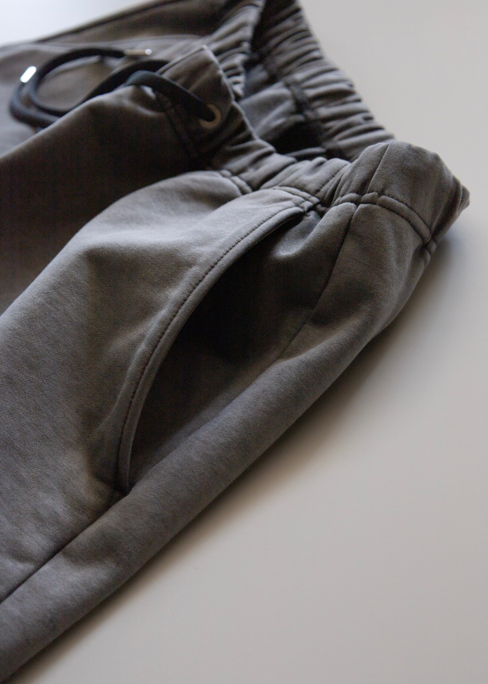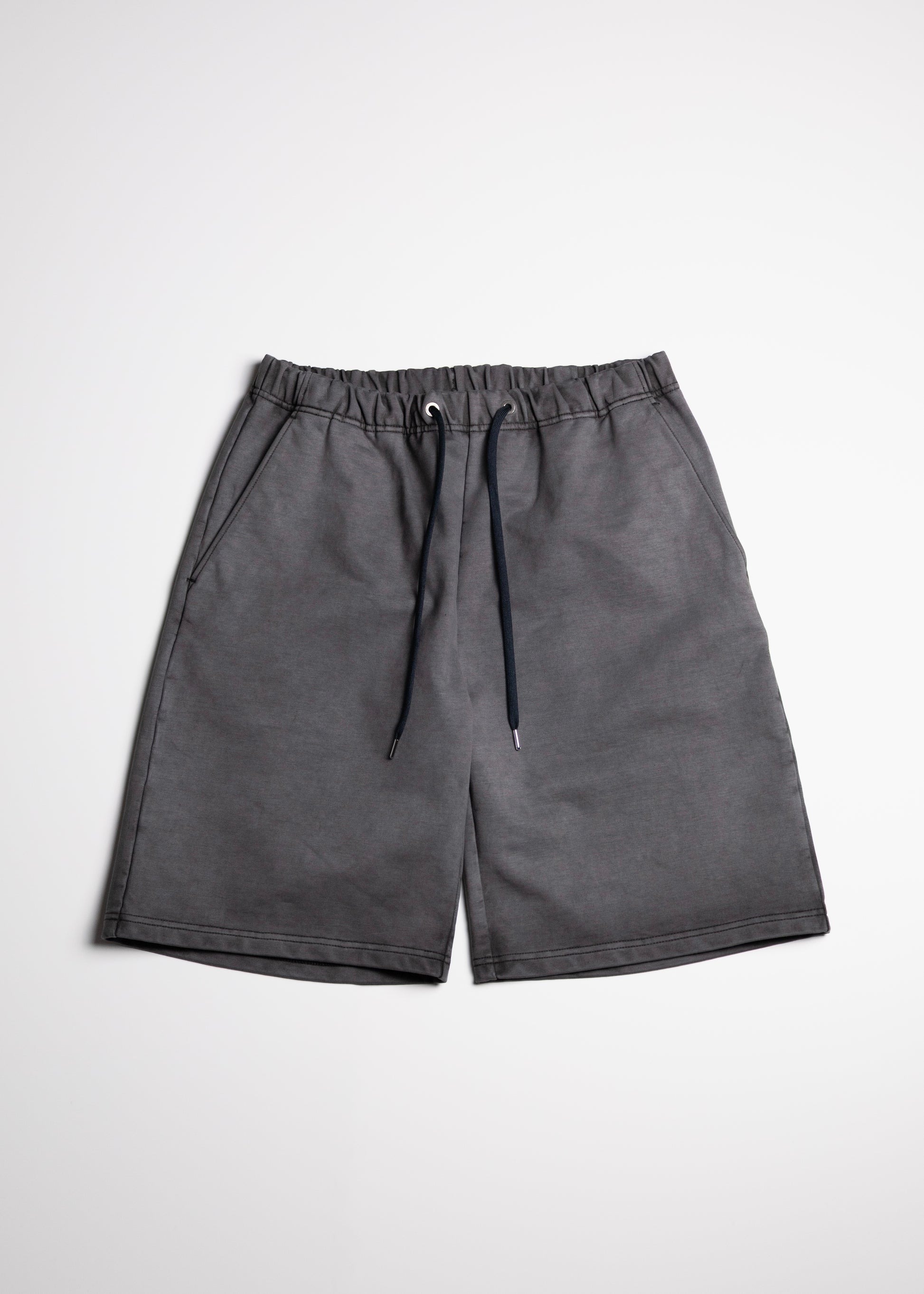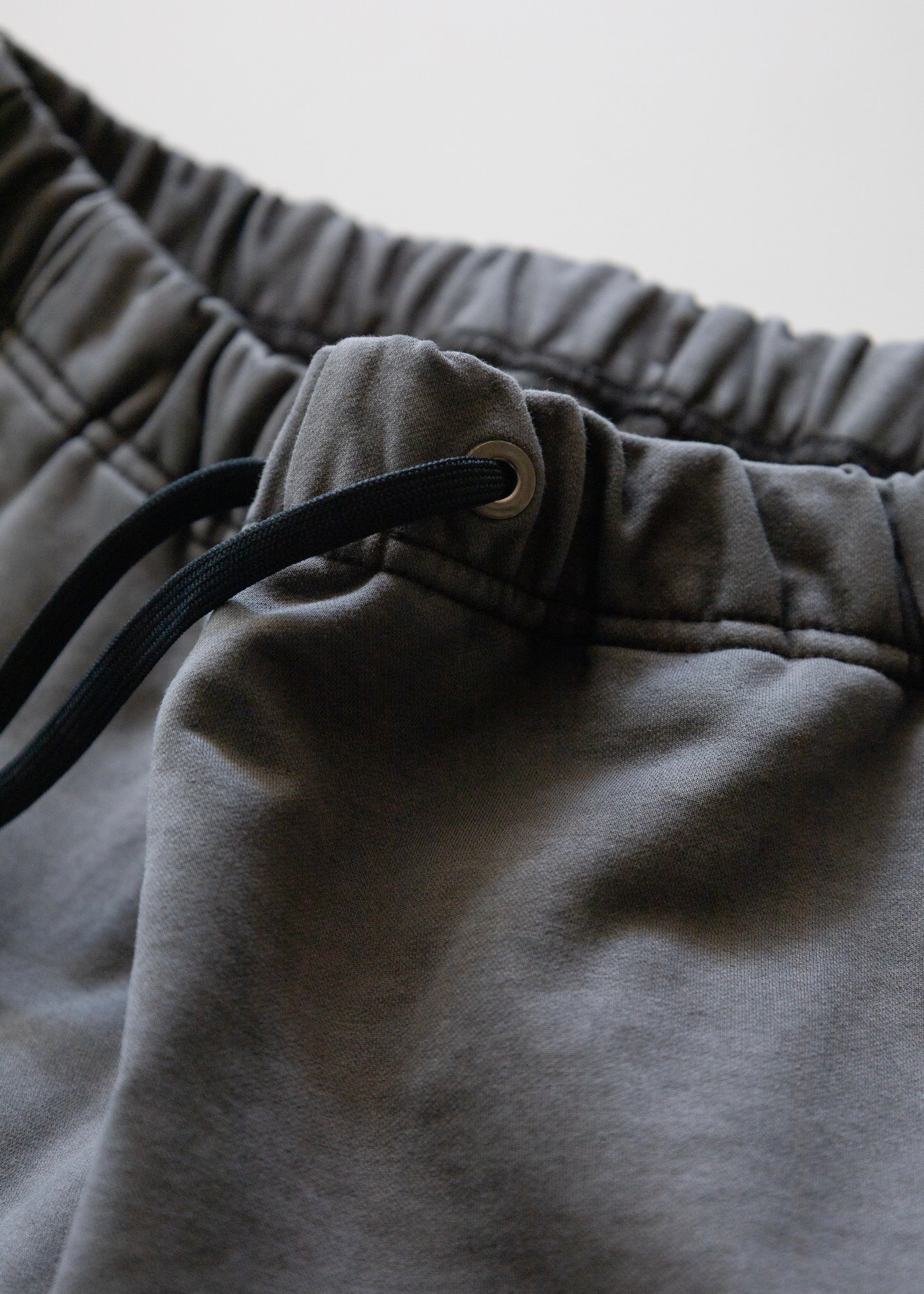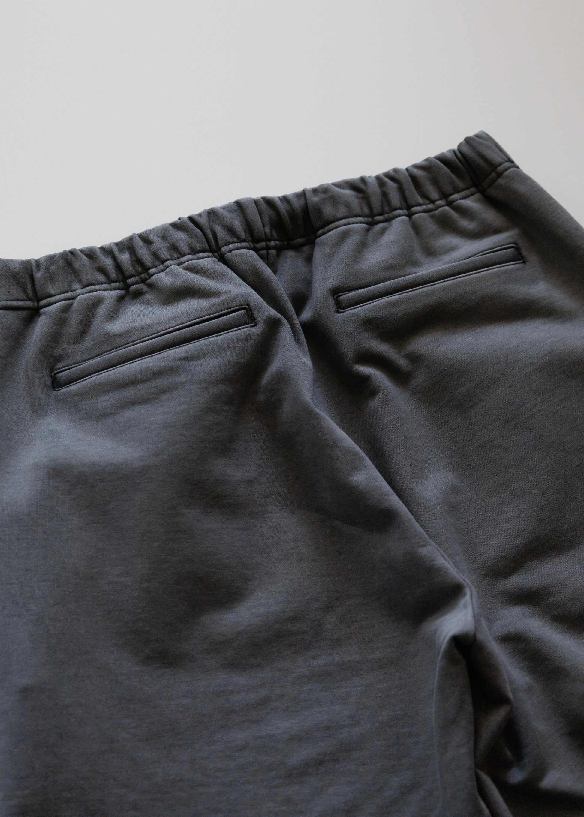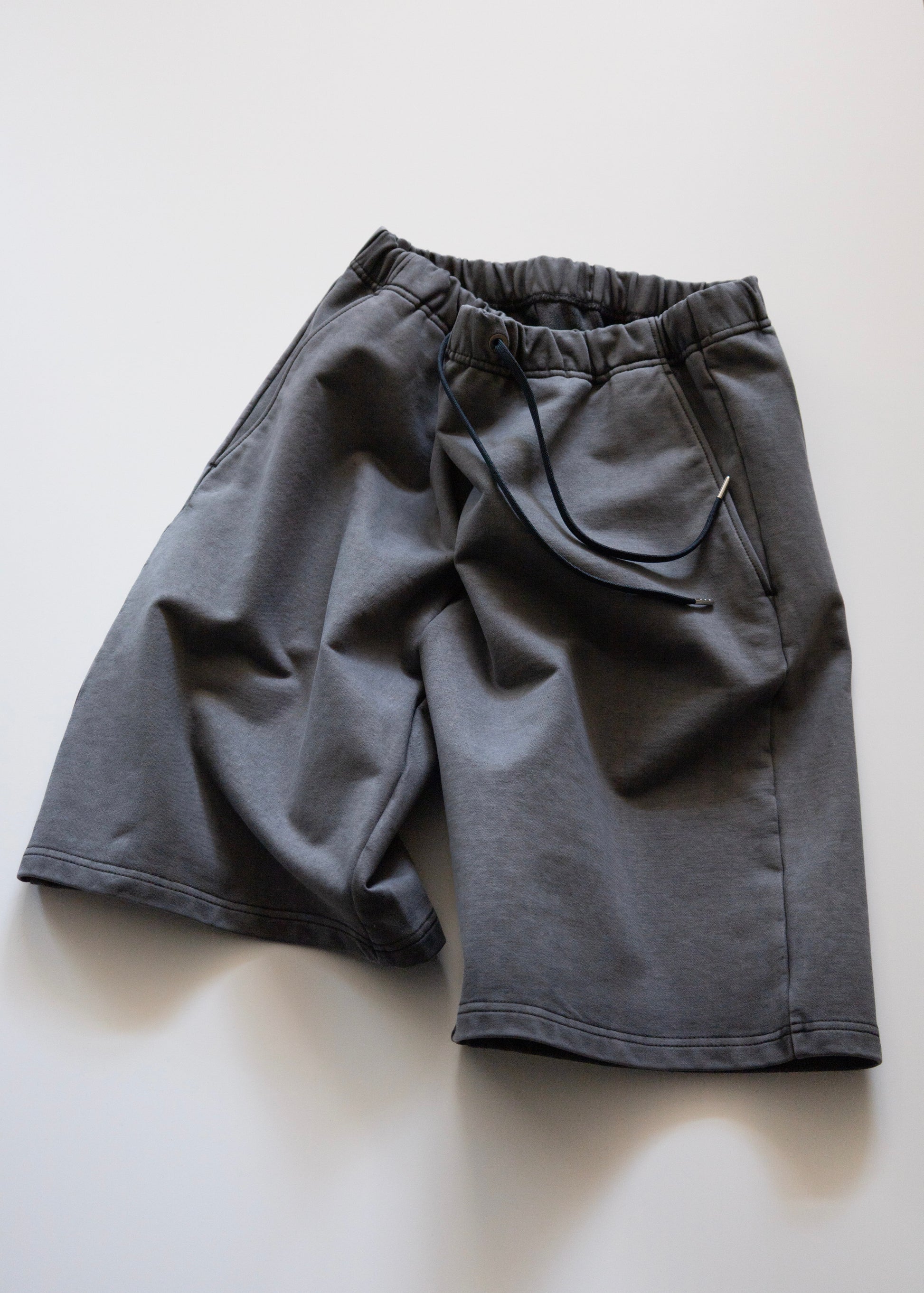 日本に 1 台しか無い、36G 裏毛機で編立てることで、今までにはない唯一無二の素材を実現。中糸に、ナイロン糸をブレンドし独特のストレッチ性ともっちり感を表現。ハイゲージと相まって独特な光沢感がある素材です。日本屈指のカットソー工場で縫製しており、縫製が難しいと言われる肉厚の高密度生地を綺麗に仕上げております。リブ周りは全てブラウジング縫製により、たるみのあるデザインに。 光沢感のある生地と相反する、リラックスなディティールを付けております。納品時に、洗いをかけ仕上げることで洗濯後の縮みなどがより無いように仕上げております。今シーズンは、ピグメントダイという特殊技法で染めております。特殊な染め工程を用いるころで、色ムラが出やすく奥行きのある色目で仕上がります。着込むことで色おちなどの経年変化が起こり、高級素材と相反したヴィンテージ加工となります。ストレートシルエットのショーツ。程よいサイズ感はどのようなシーンでも着用頂けます。