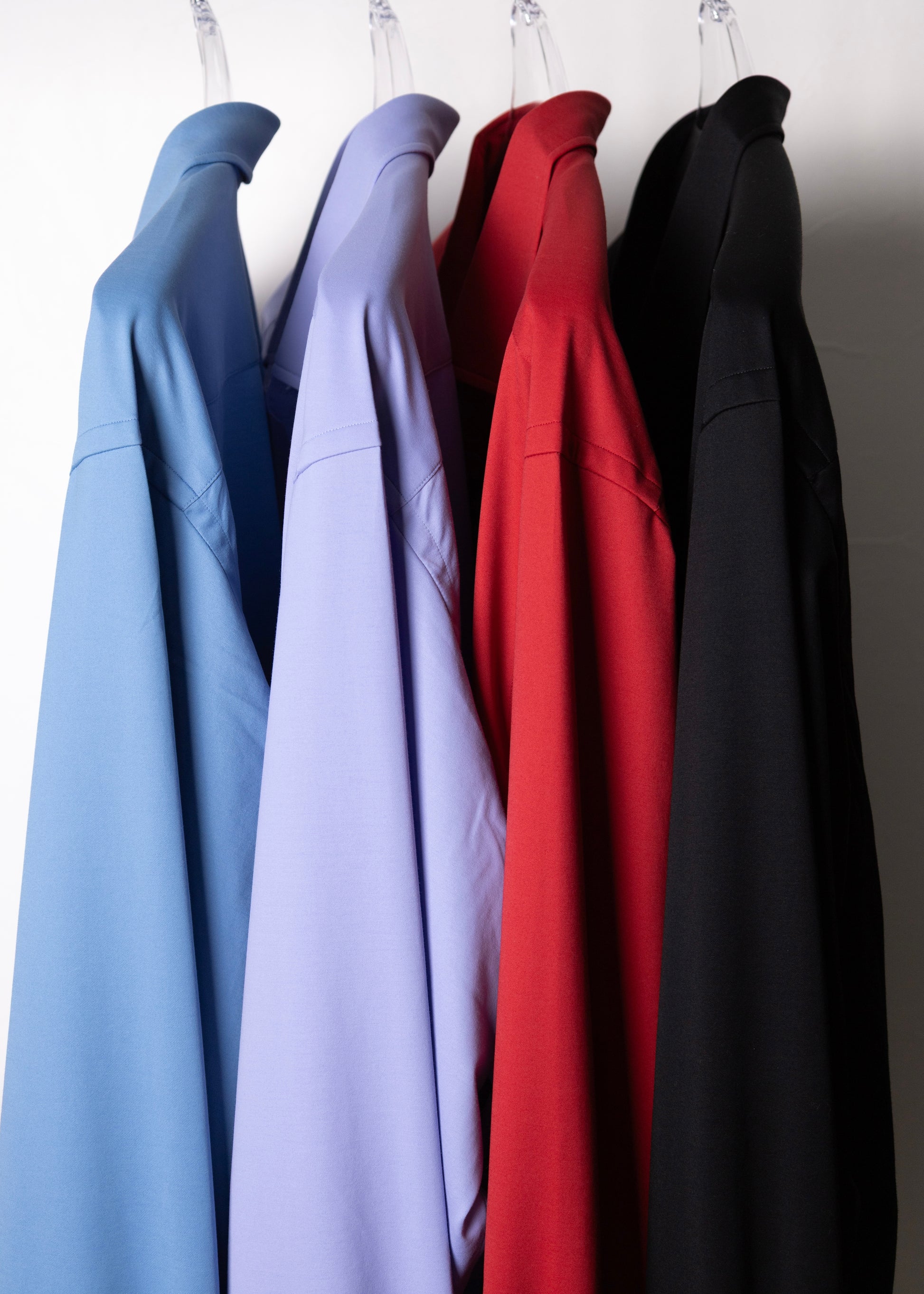 ストレッチ性が高く一度着ると止められない着心地、そして、着用時のしわなどの形態変化も少なく、イージーケア性も高い。