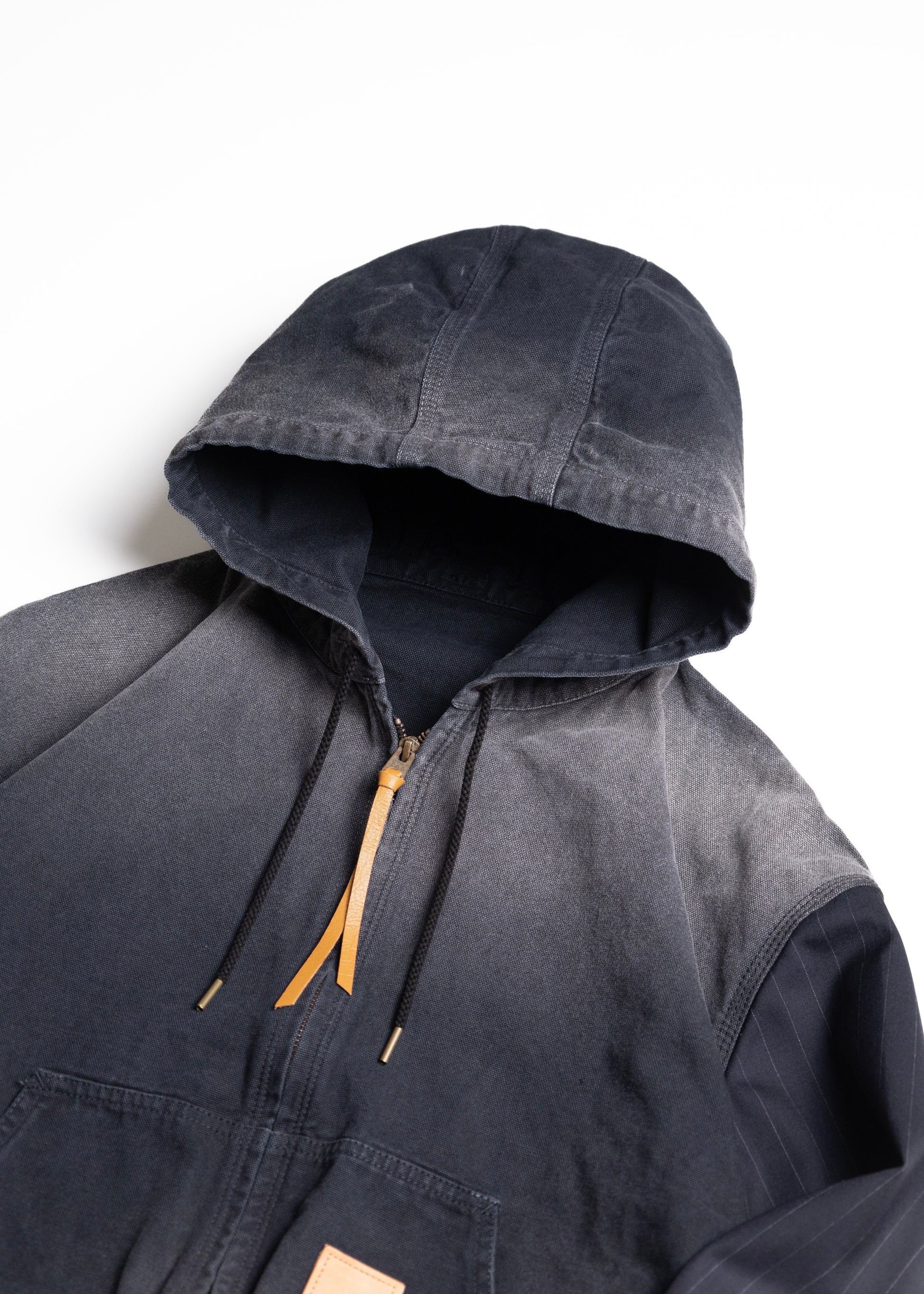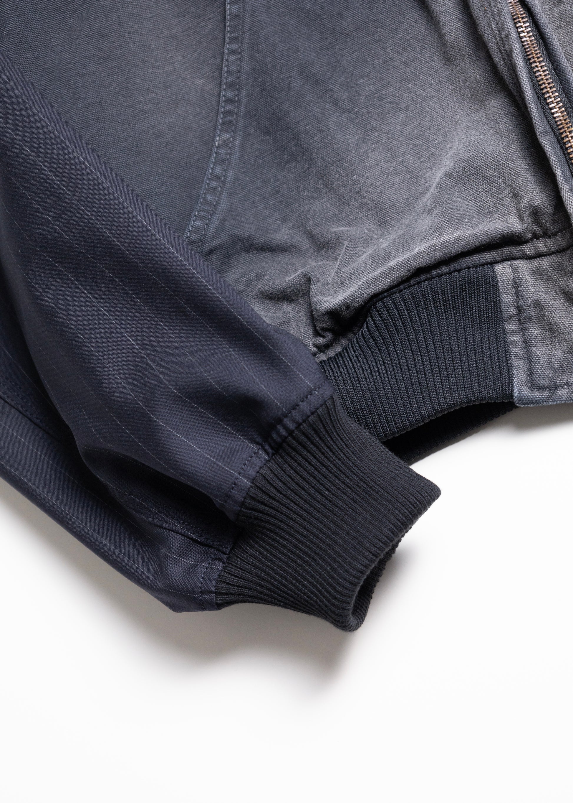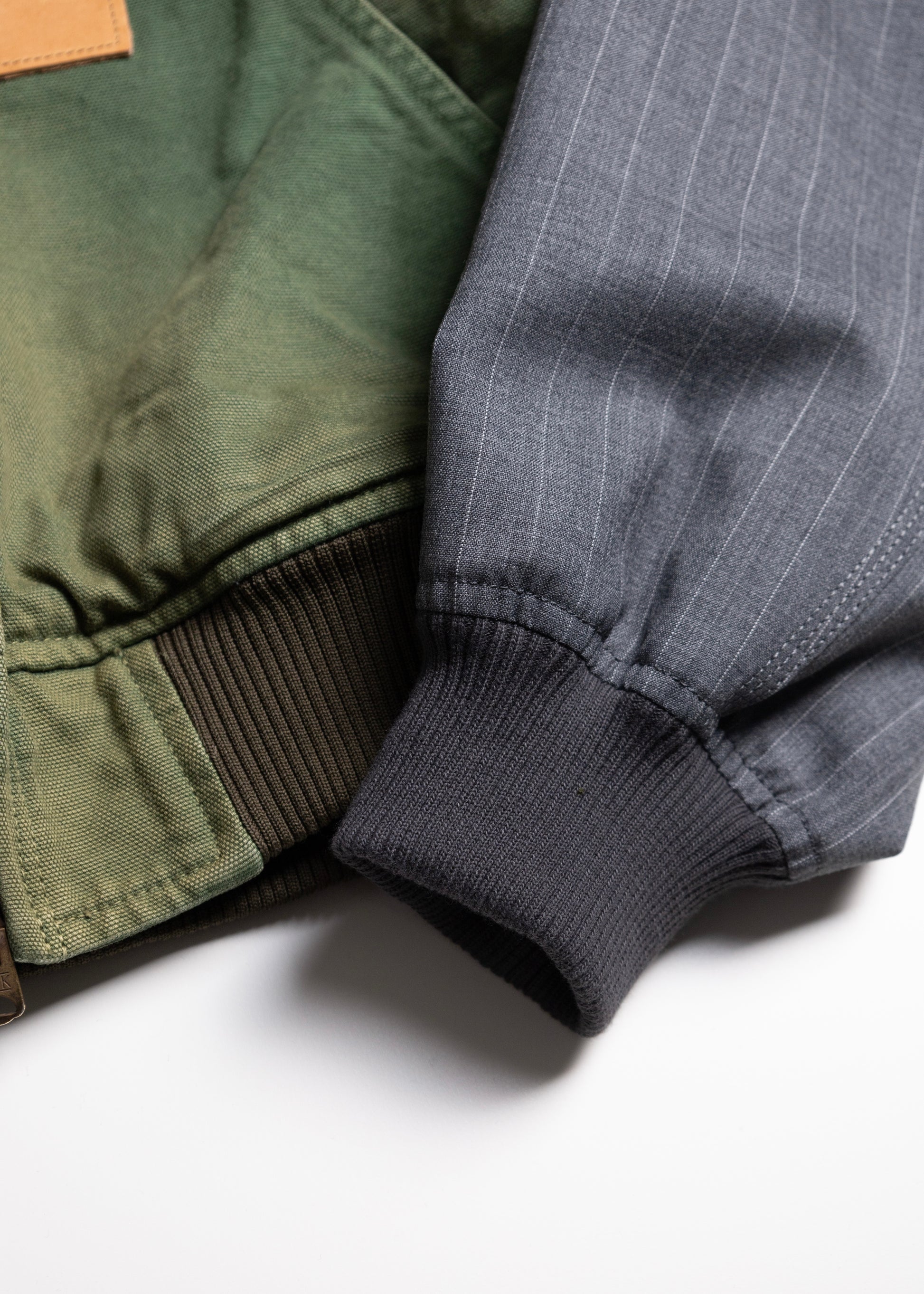 当品番はそんなシーズンを代表する 1 着です。ヴィンテージの加工を施した前身頃の生地に対してペインターパンツ形のカッティングでストライプウールを袖と見頃で組み合わせたジャケット。