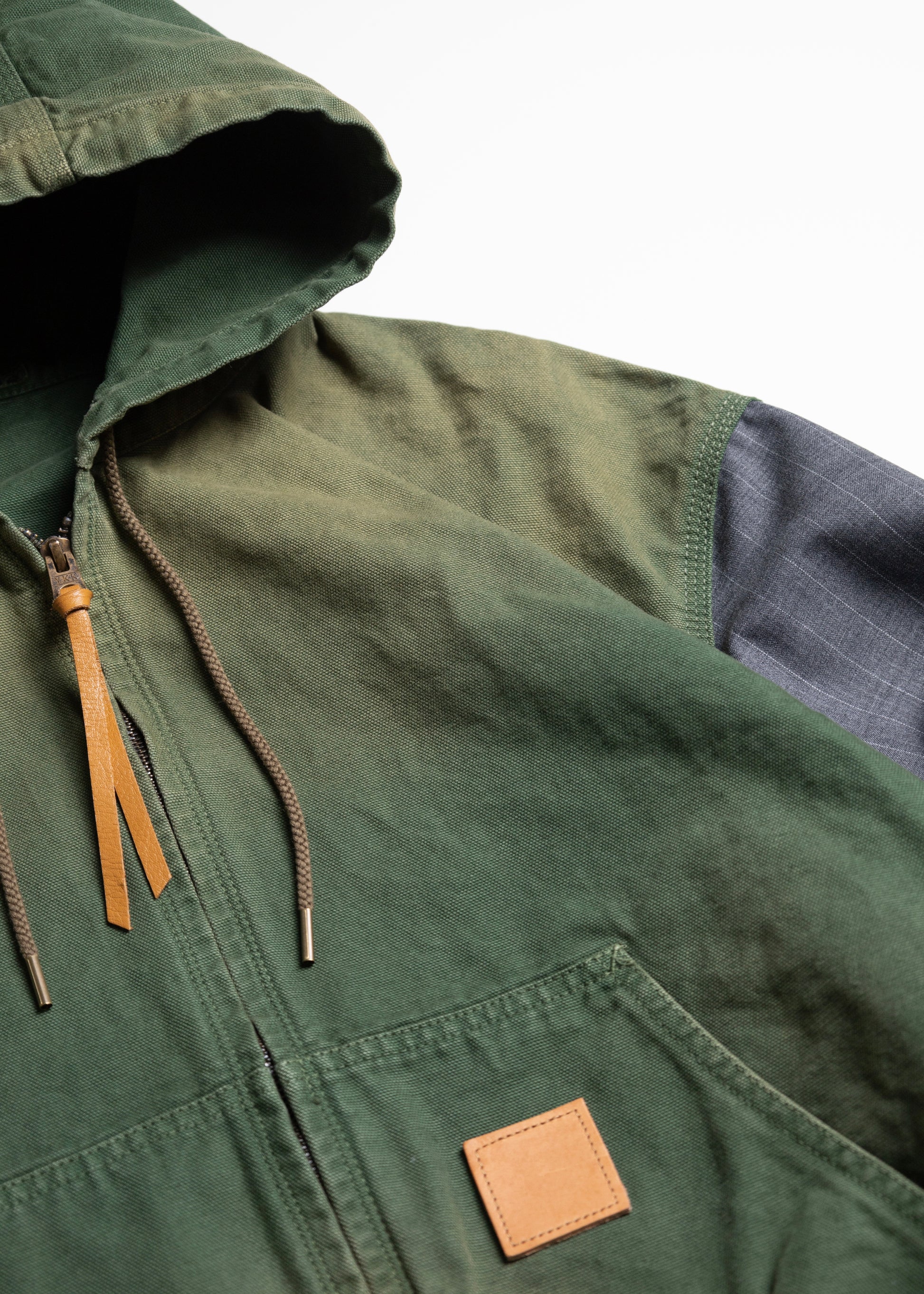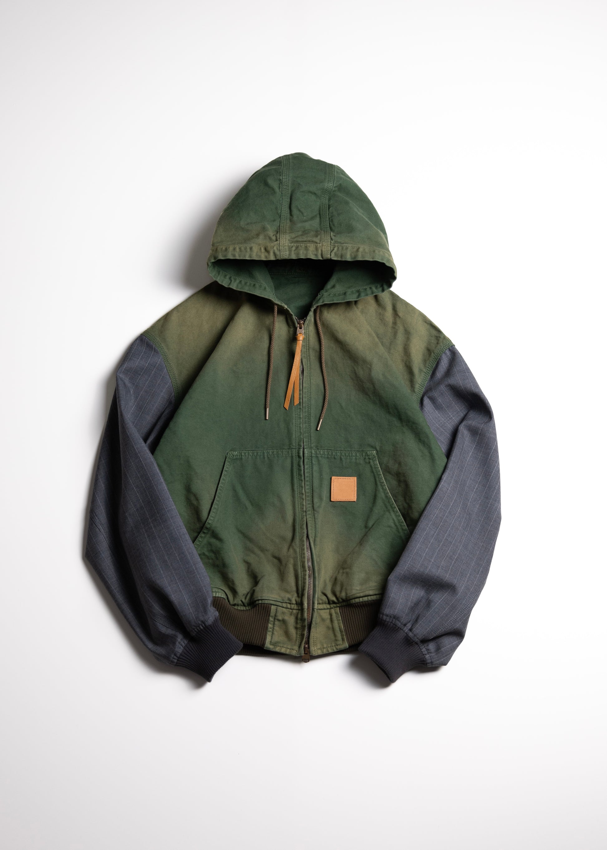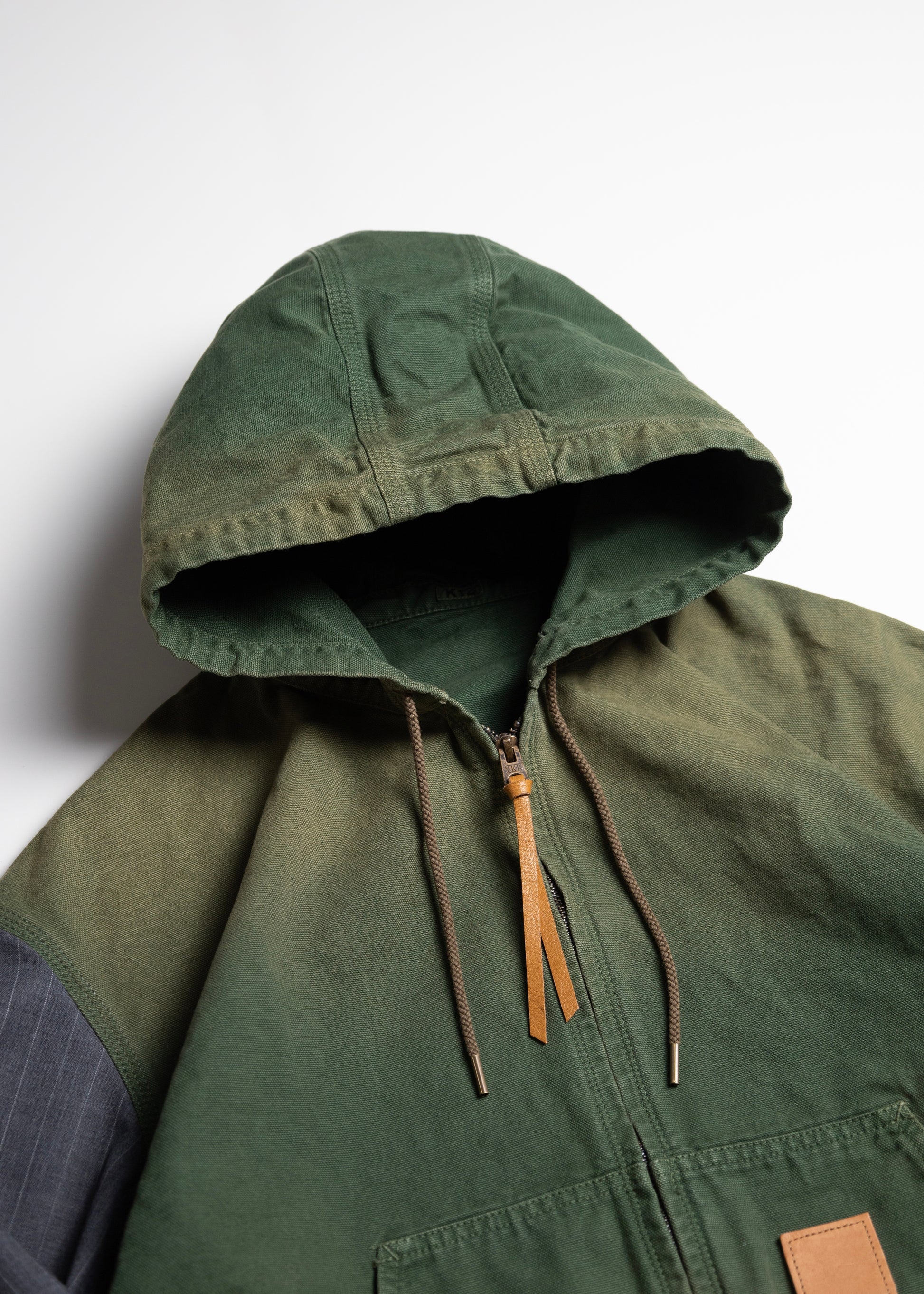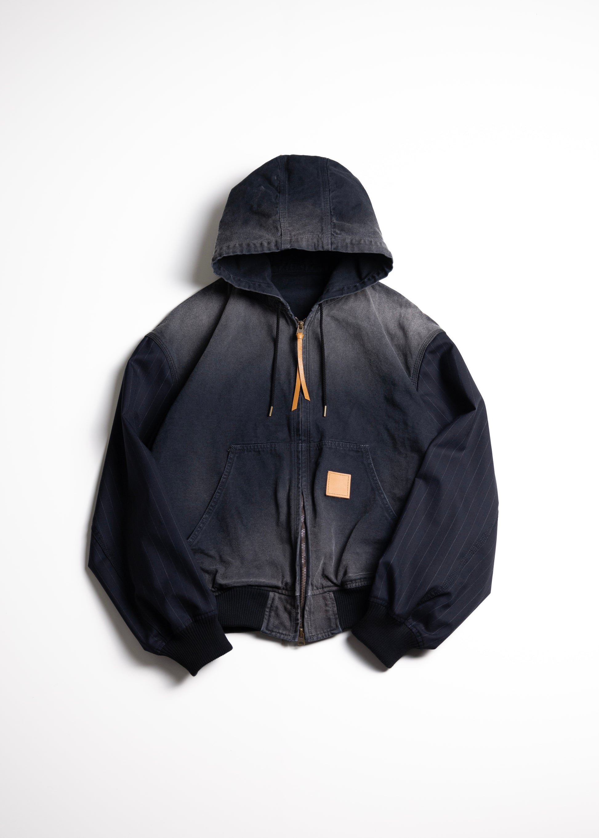 当品番はそんなシーズンを代表する 1 着です。ヴィンテージの加工を施した前身頃の生地に対してペインターパンツ形のカッティングでストライプウールを袖と見頃で組み合わせたジャケット。