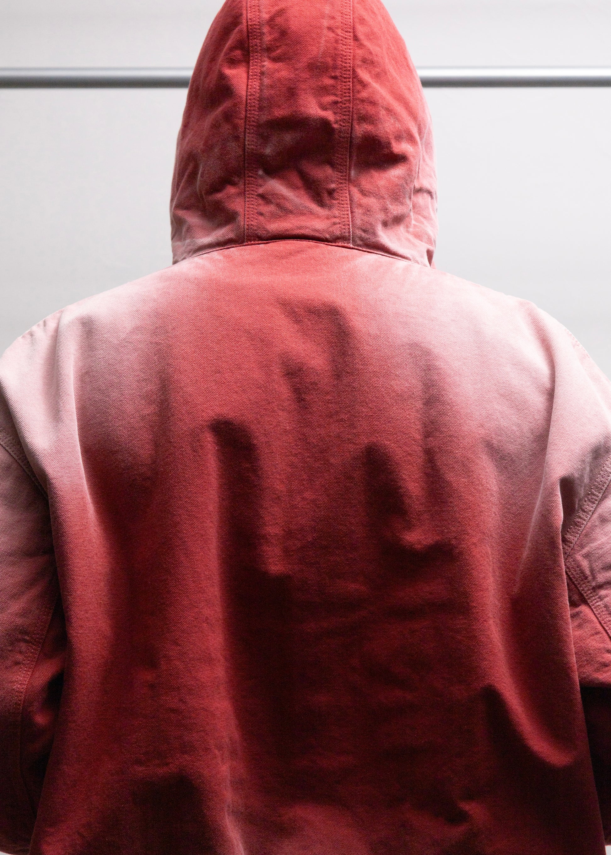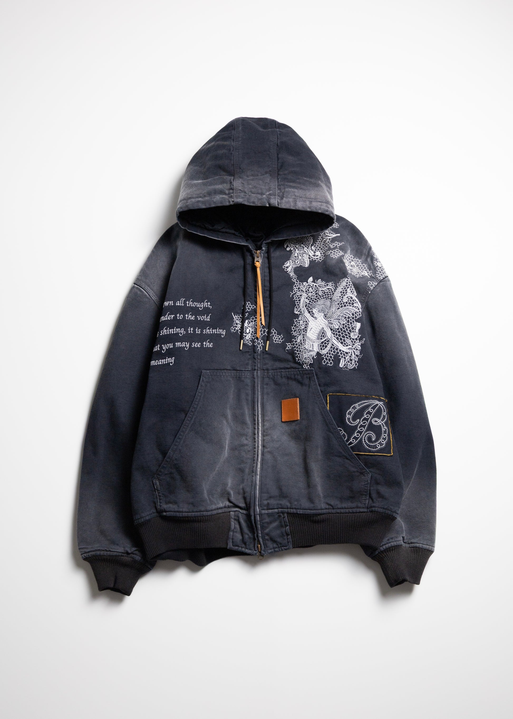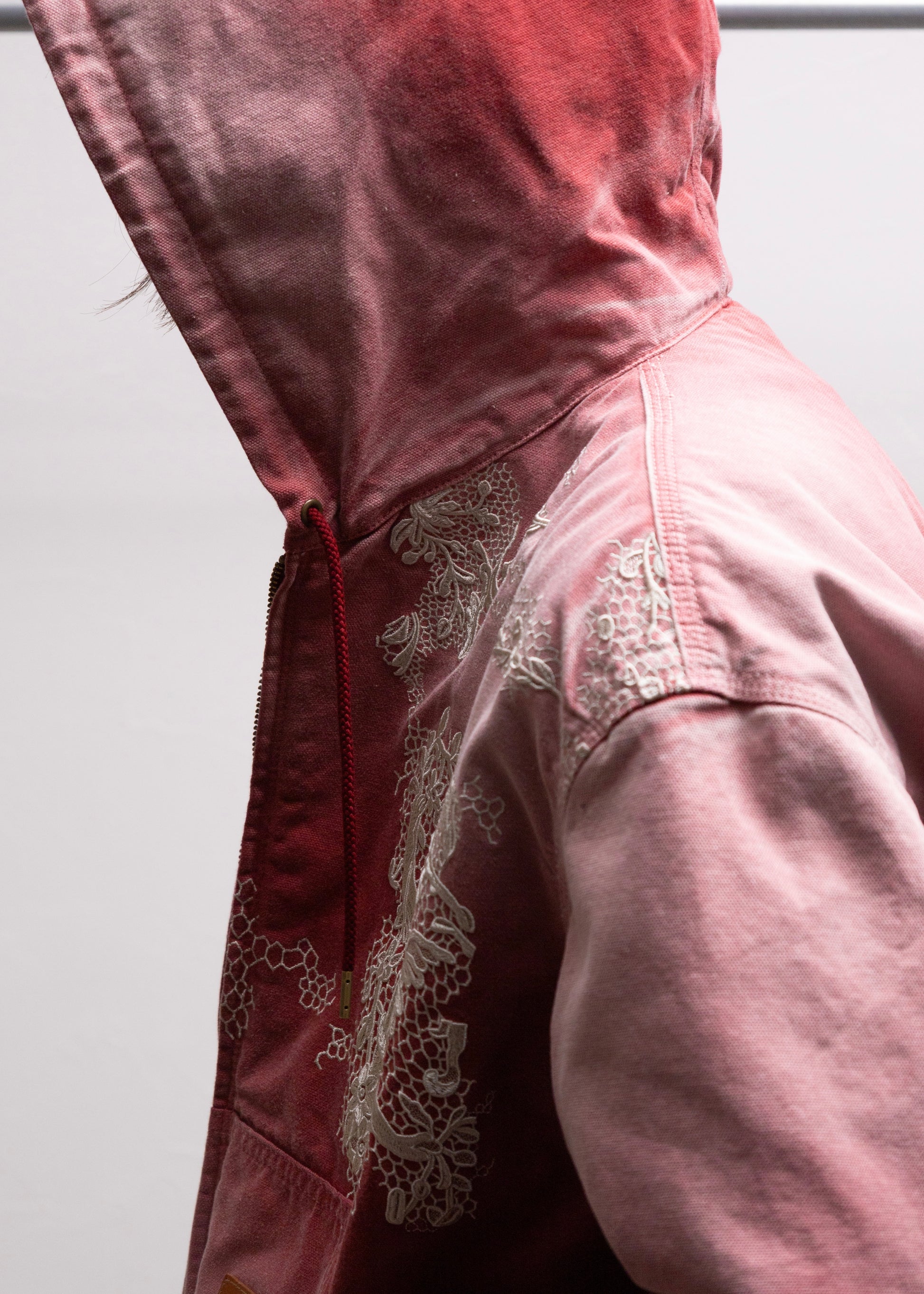 今季のキーワードのひとつである、メンズ服の文脈におけるレースの活用を投影した、フーディーワークジャケット。