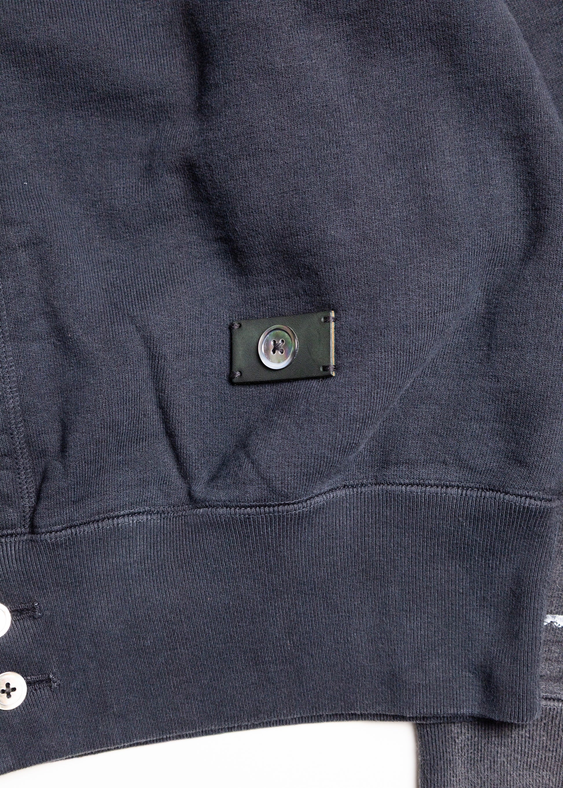 カレッジロゴシリーズのKHOKI定番、丸首スウェットカーディガン。貝ボタンを採用しているので、カジュアルでも上品に着られるアイテムです。リアルなヴィンテージ加工は、1点1点職人によって施されており絶妙な色味をお楽しみ頂けます。