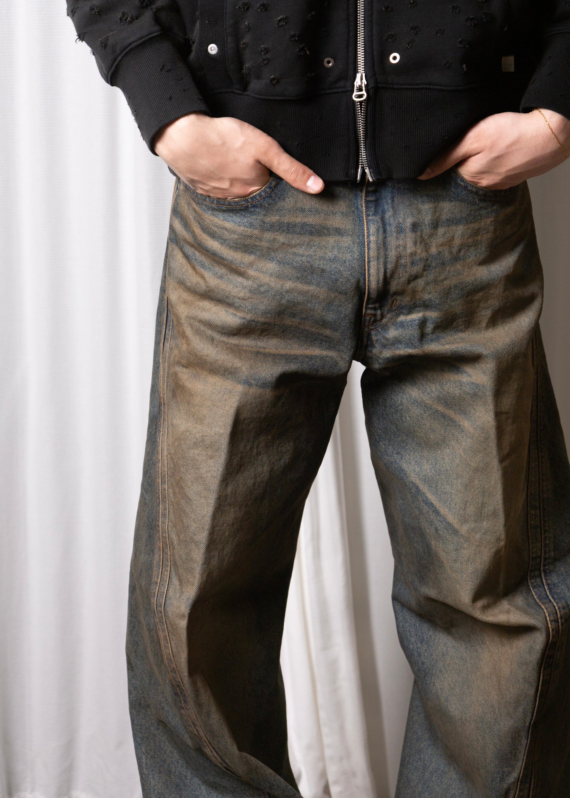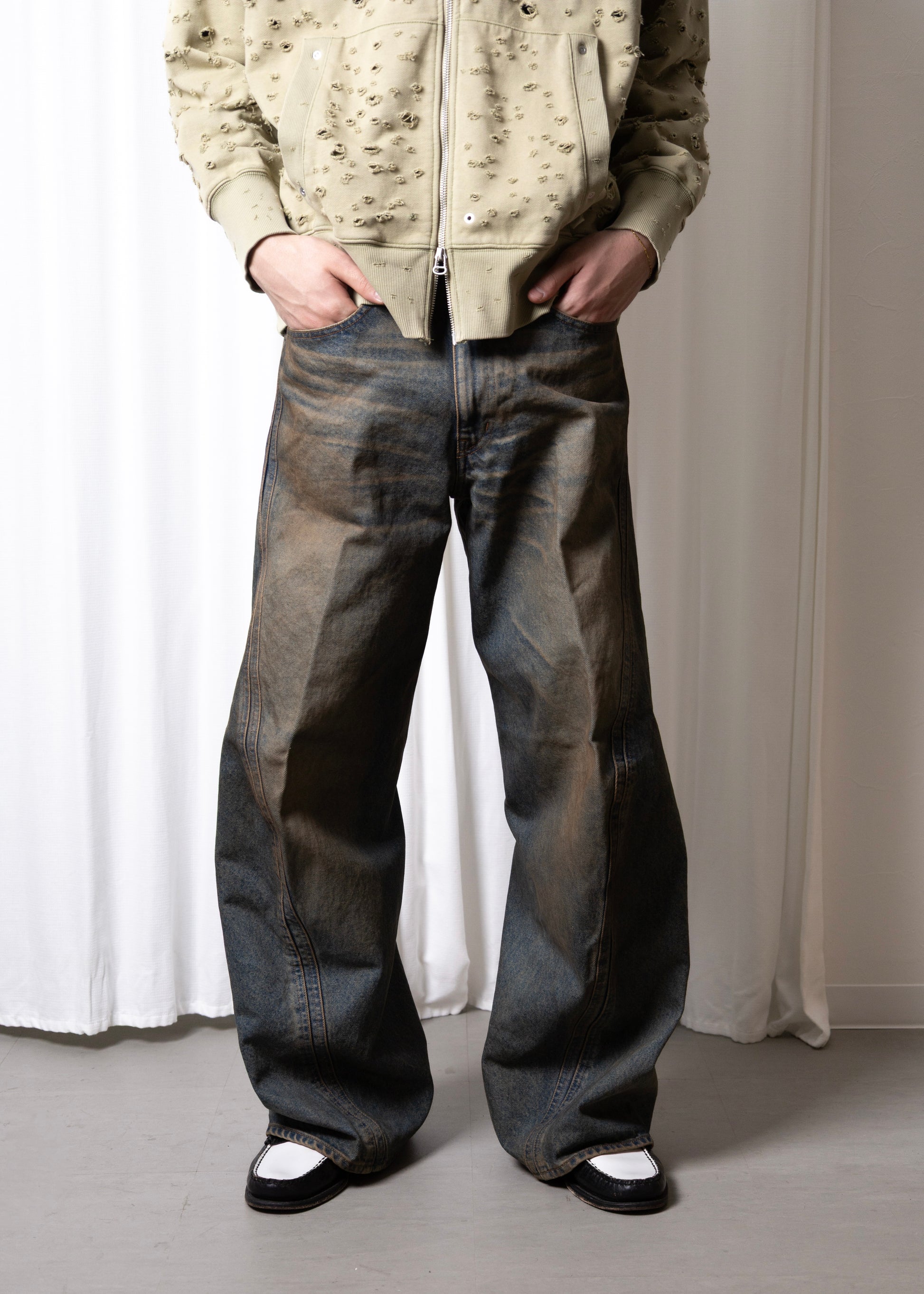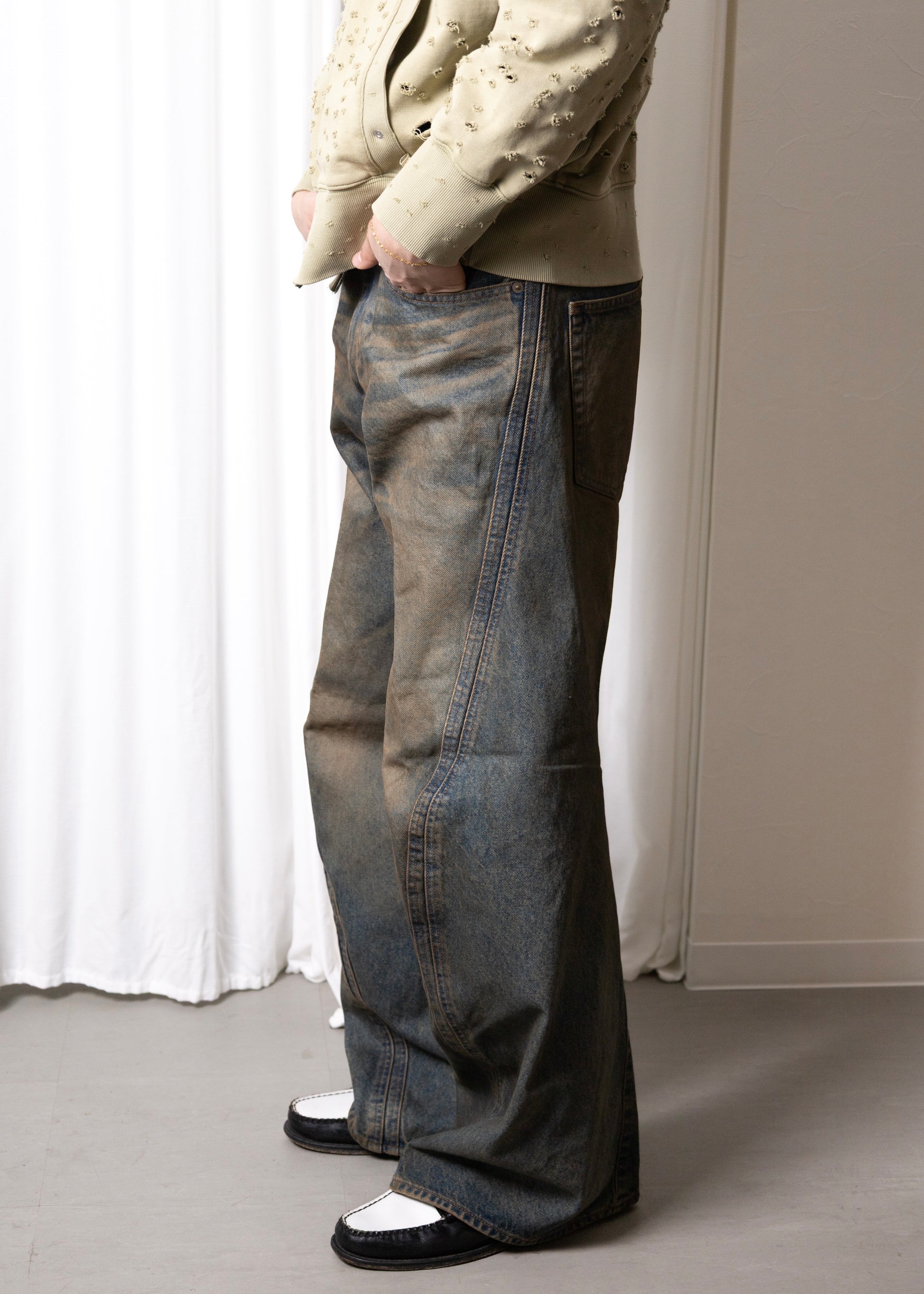 14ozのムラ糸空紡糸によるインディゴデニムを使用したワイドシルエット立体裁断ジーンズ。ヴィンテージウォッシュ加工。00's初期に見られた立体裁断ジーンズから着想し現代的なシルエットにアップデートしました。人間工学に基づいた立体裁断で3Dパターンメイキングを駆使し、膝や足回りの動きやすさを解放する為にサイドシームが大きく捻じれたデザインが特徴です。サイドシームを二重に入れる事で視覚、構造共に立体的なシルエットを強調しています。定番展開しているシグネチャーアイテムです。