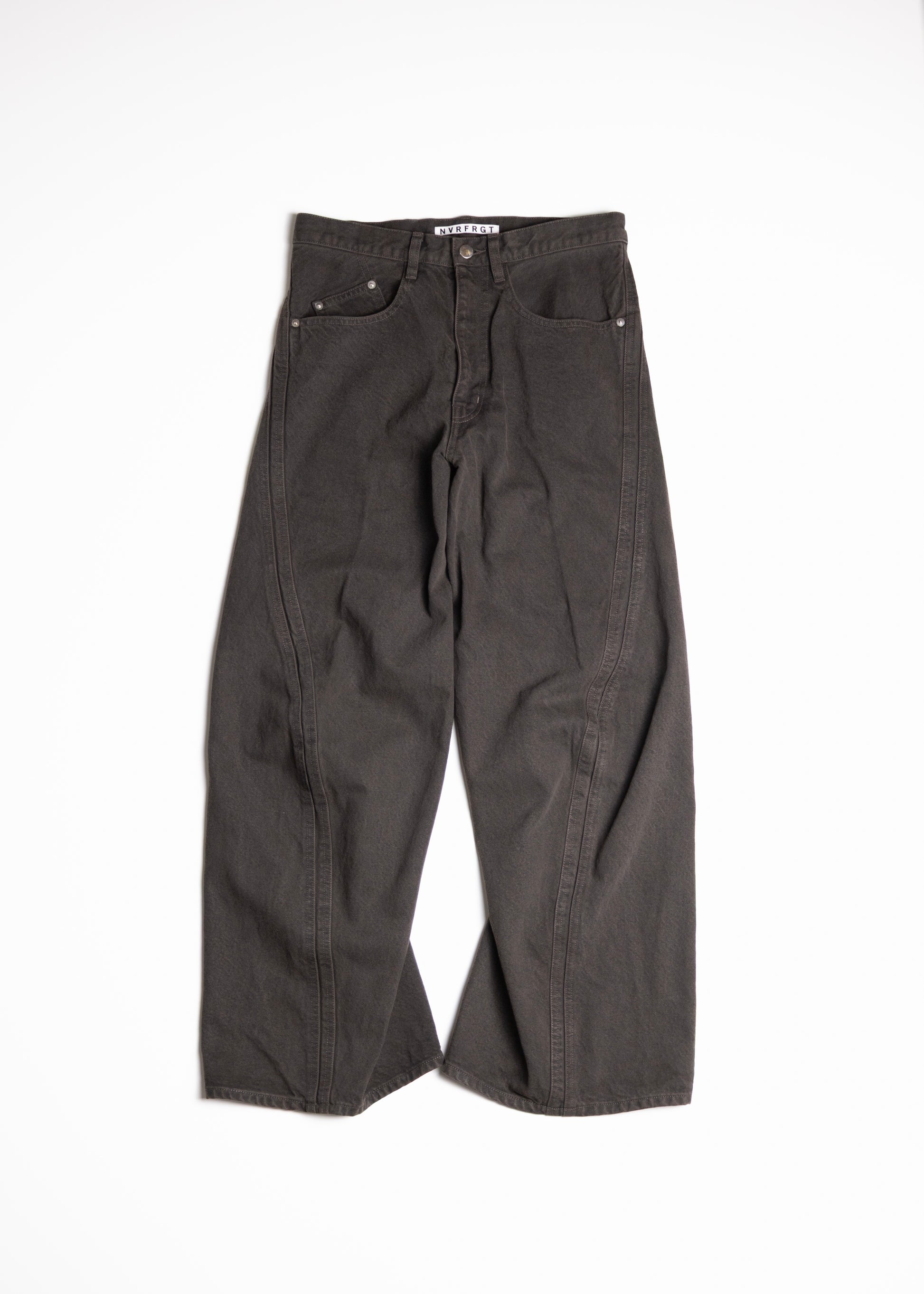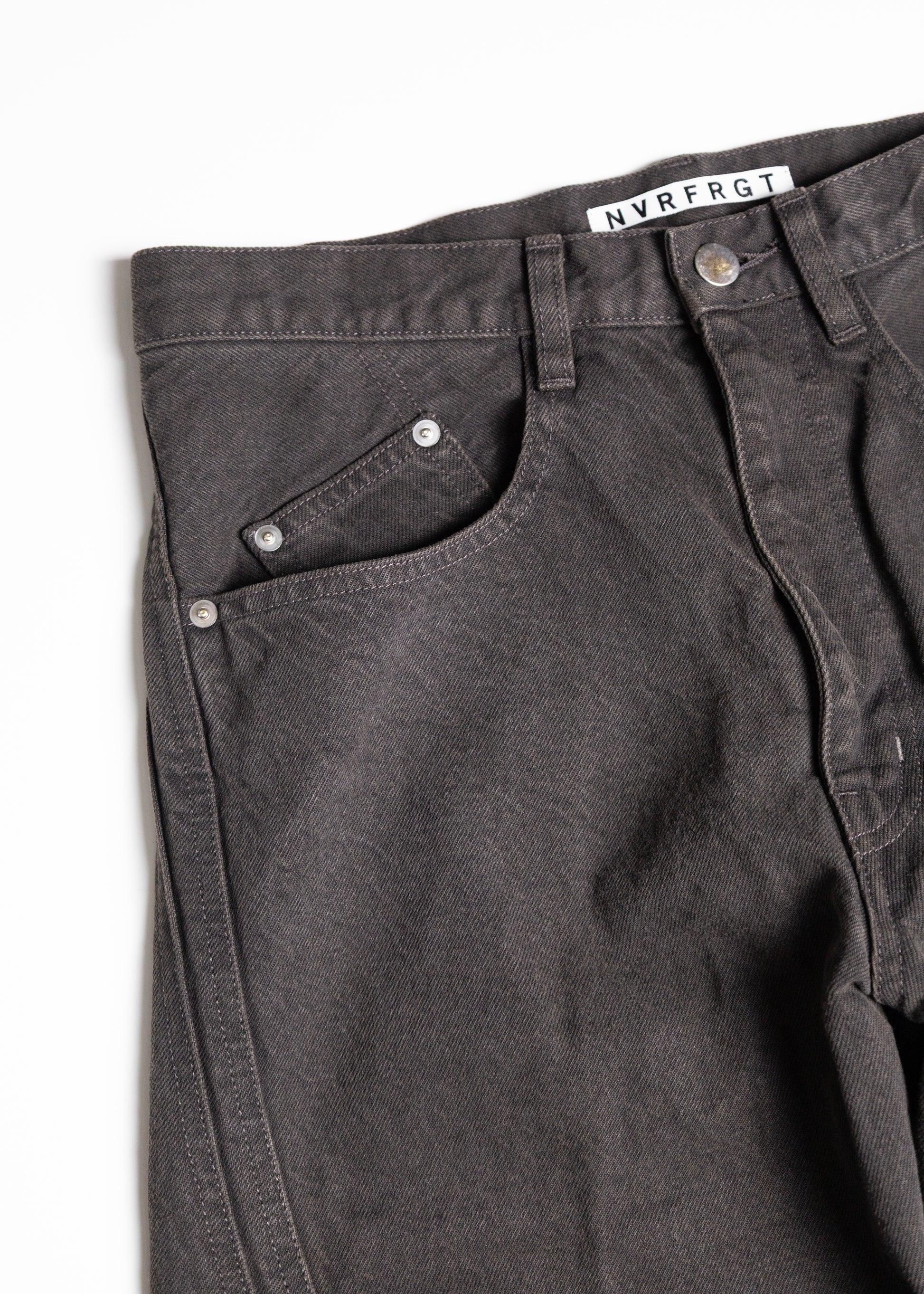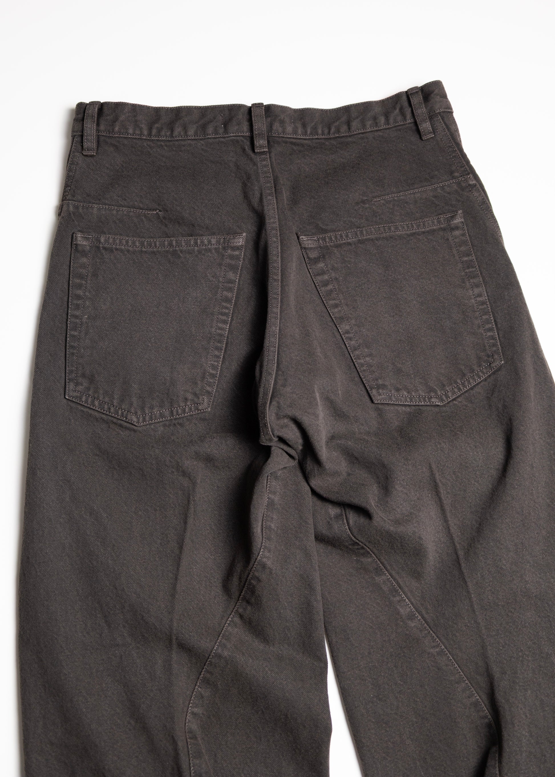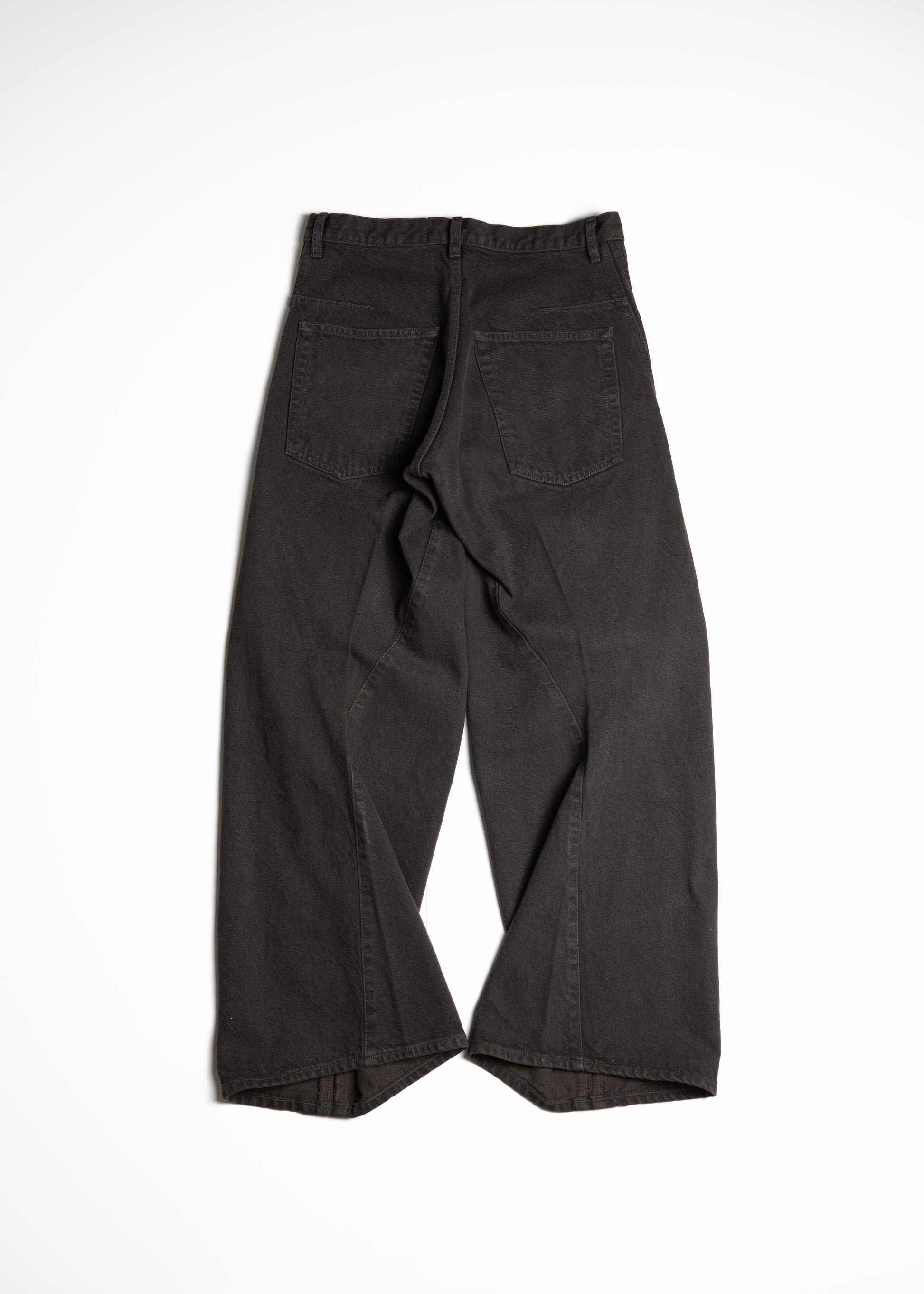 12.5ozの深染めブラックデニムを使用したワイドシルエット立体裁断ジーンズ。ブラックデニムからストーンバイオでアタリを付けさらにブチーチを加えて下地のブラック感をほど良く残した上にオーバーダイをする事により、単なる製品染めよりも、表情豊かな深みのある色を表現しています。00's初期に見られた立体裁断ジーンズから着想し現代的なシルエットにアップデートしました。人間工学に基づいた立体裁断で3Dパターンメイキングを駆使し、膝や足回りの動きやすさを解放する為にサイドシームが大きく捻じれたデザインが特徴です。サイドシームを二重に入れる事で視覚、構造共に立体的なシルエットを強調しています。定番展開しているシグネチャーアイテムです。