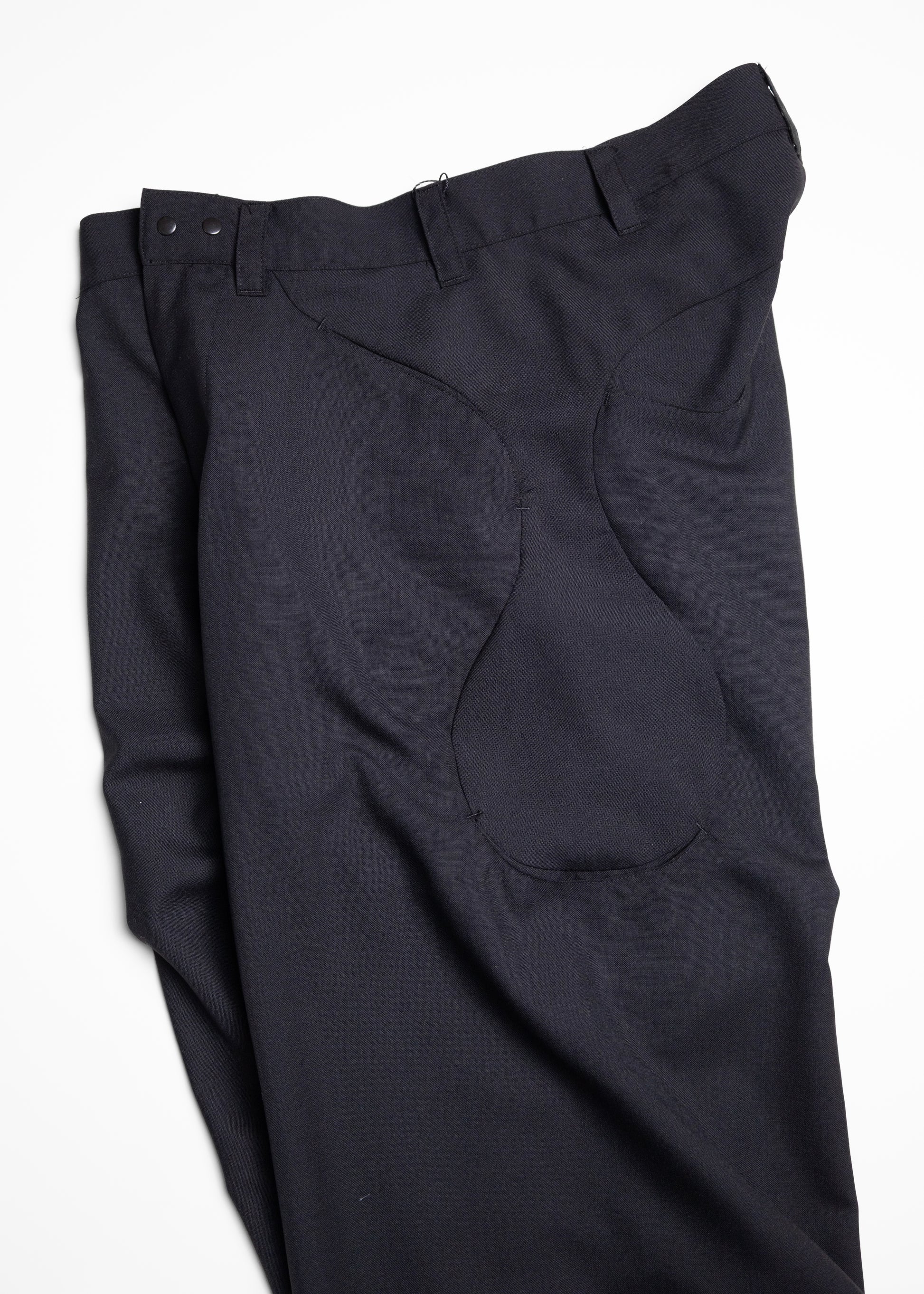 大きく3面構成されており一筆書きの様に曲線を描きながら後ろヨークから前へポケットの機能を加えながら繋がっている脇線をなくすことにより着用時のストレスを軽減する仕様
