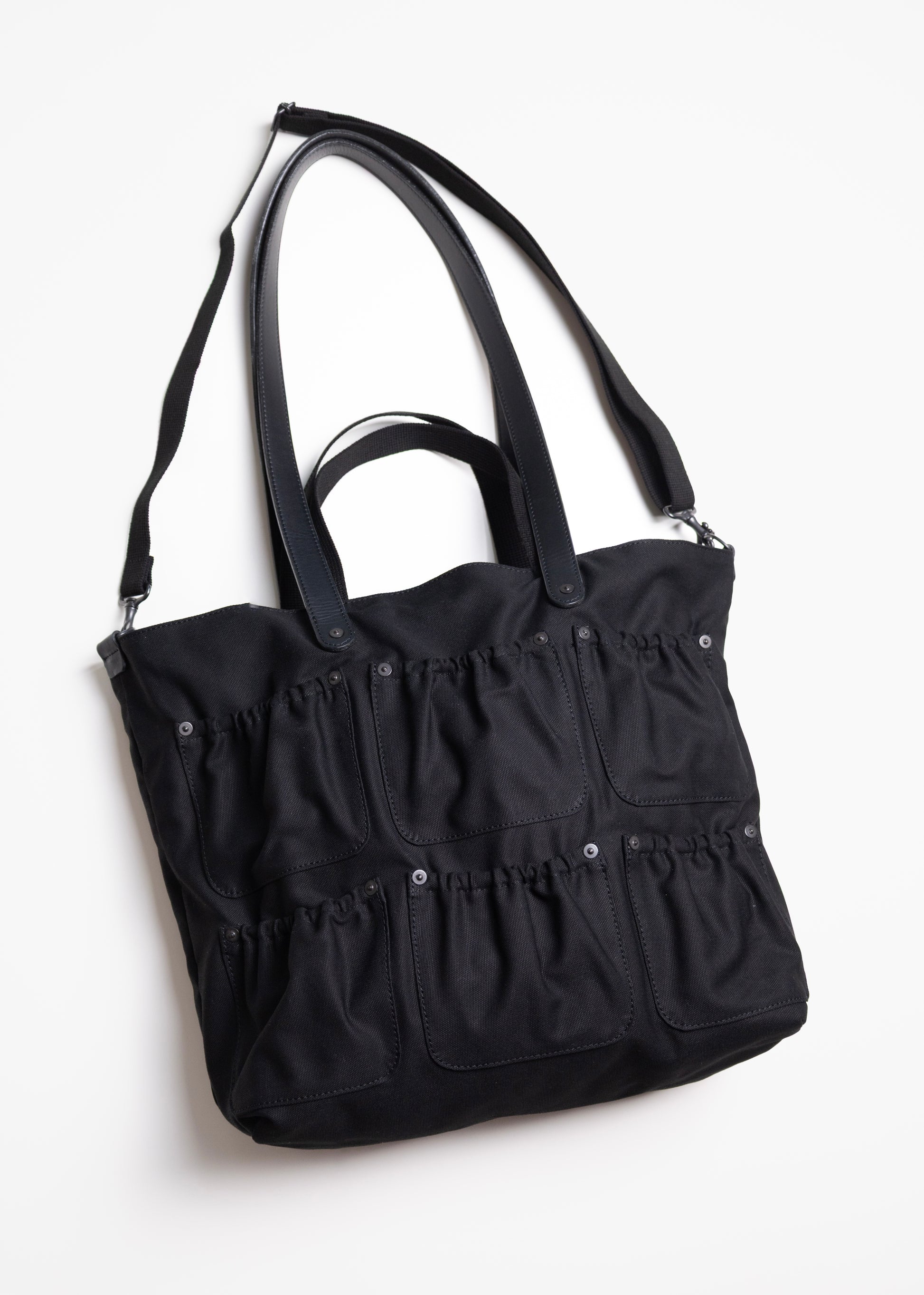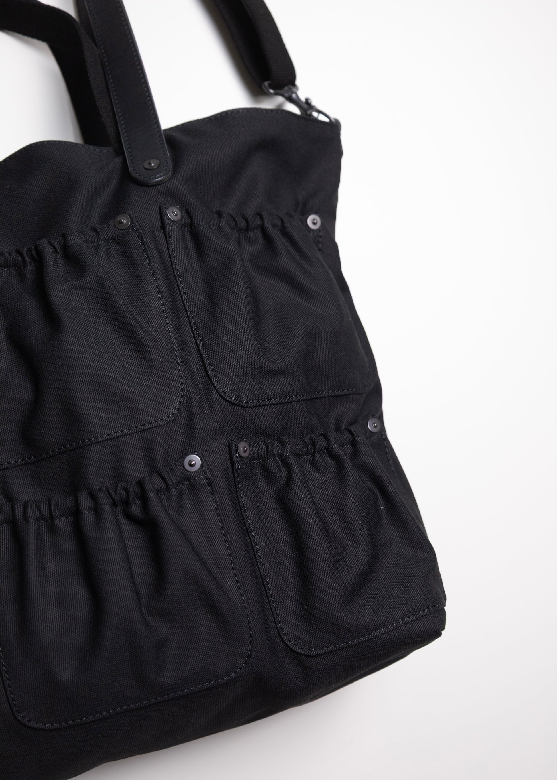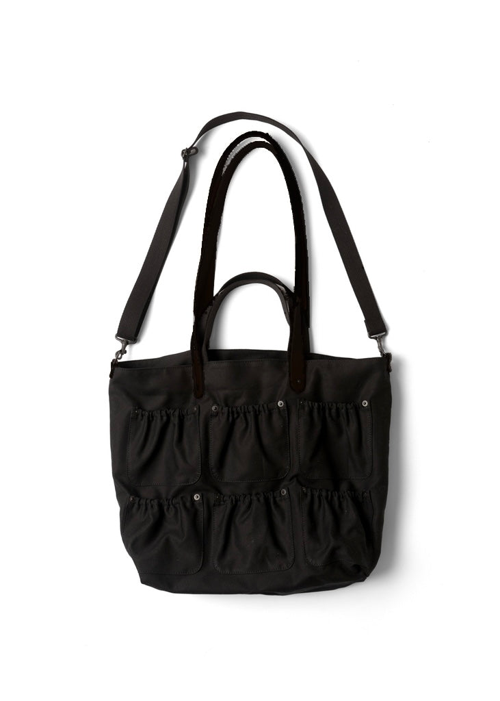 釘や工具を入れるツールバッグをイメージしたトートバッグ。 異なる長さの持ち手が特徴的です。 素材は太番手を引き揃えて織ったボリュームあるコットンダックを使用しています。 高密度でしっかりとした肉感を持ちつつ、原糸の持つ粗野な風合いが活きている素材です。