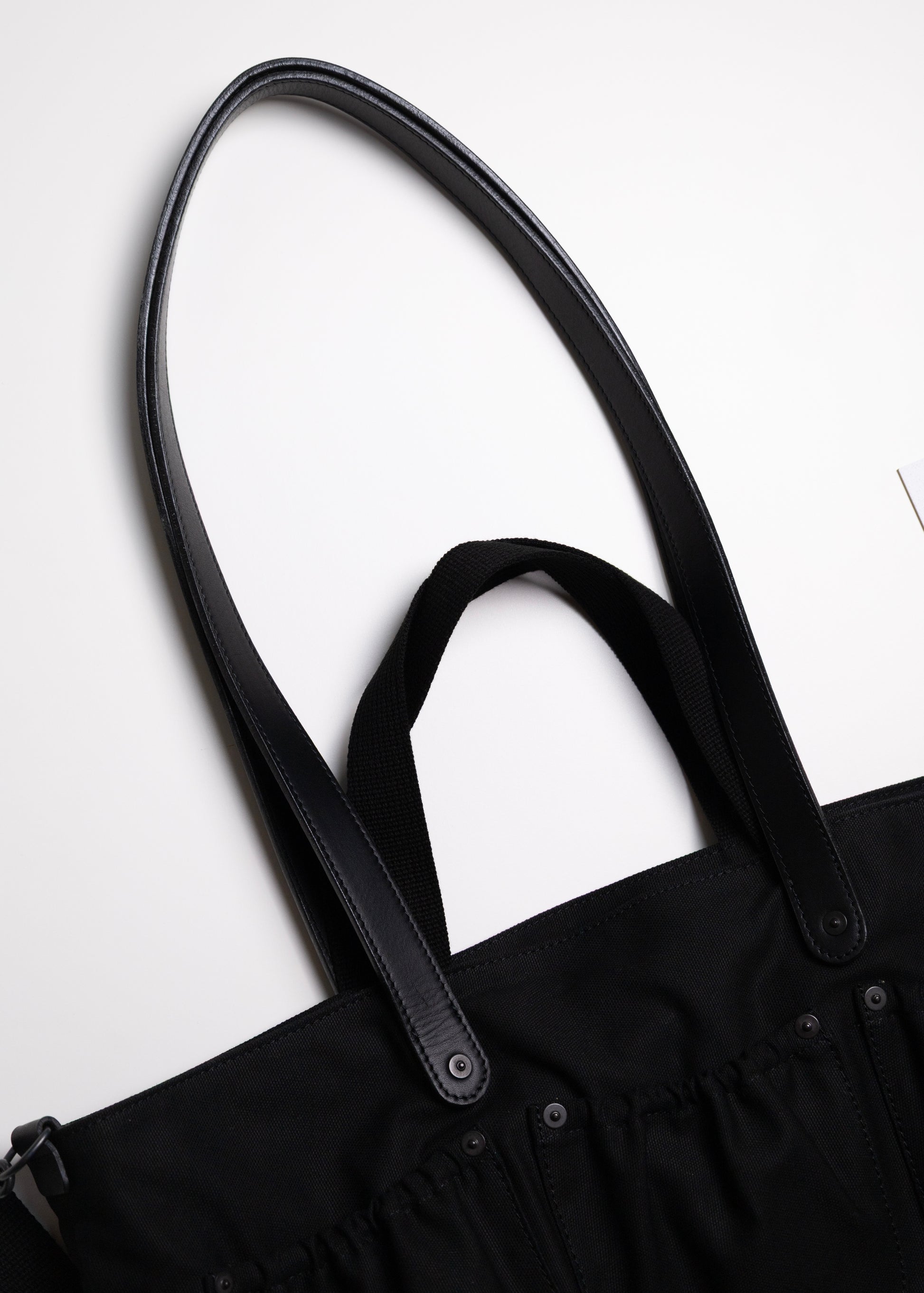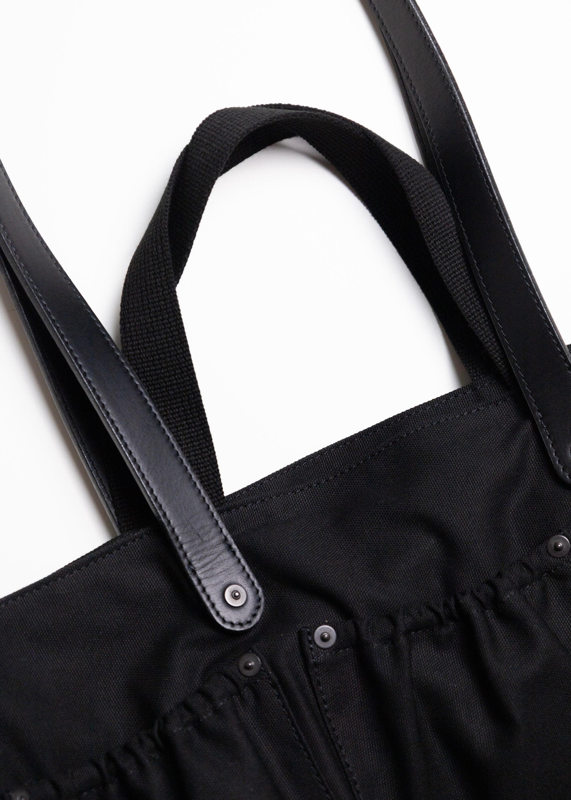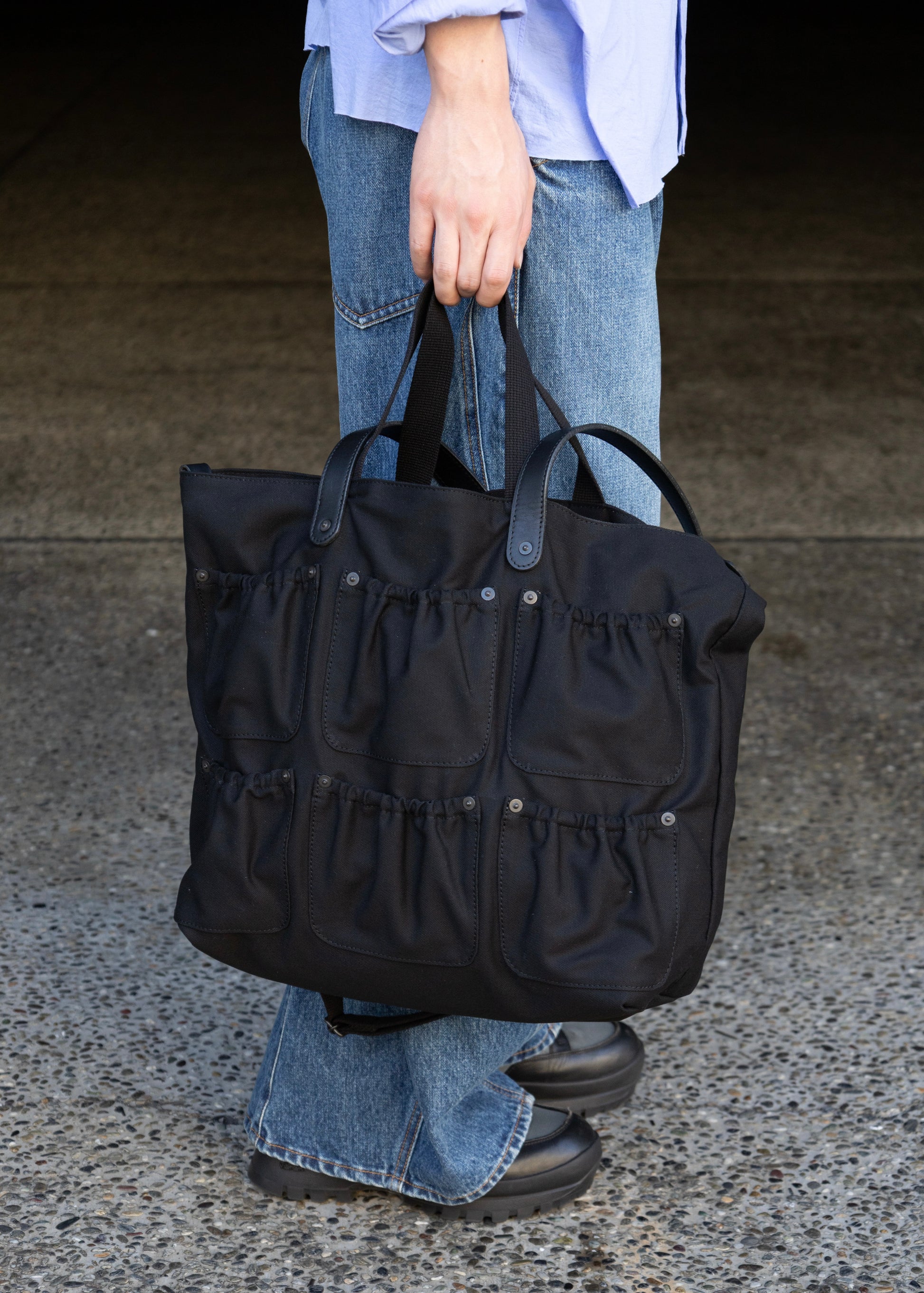 釘や工具を入れるツールバッグをイメージしたトートバッグ。 異なる長さの持ち手が特徴的です。 素材は太番手を引き揃えて織ったボリュームあるコットンダックを使用しています。 高密度でしっかりとした肉感を持ちつつ、原糸の持つ粗野な風合いが活きている素材です。