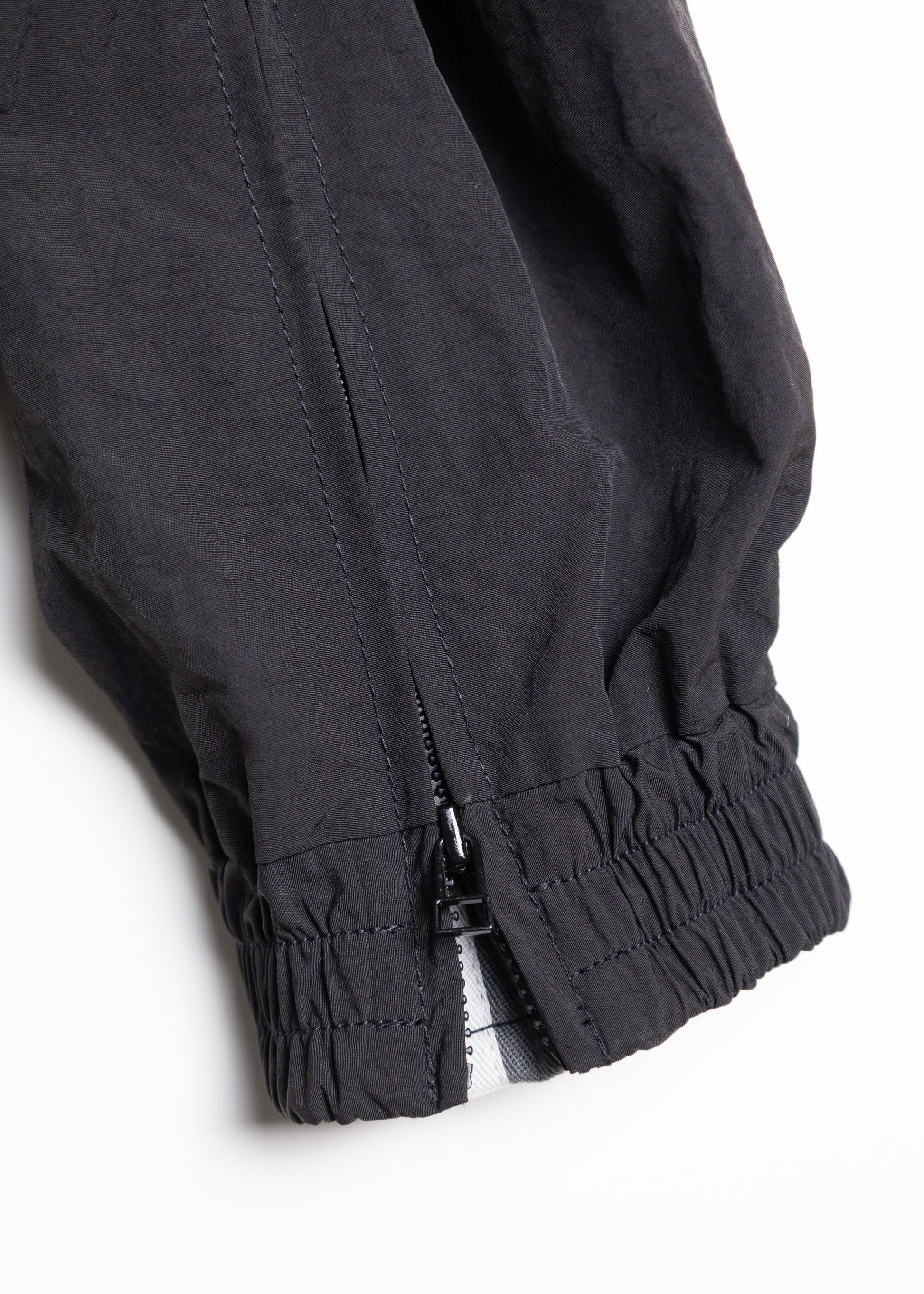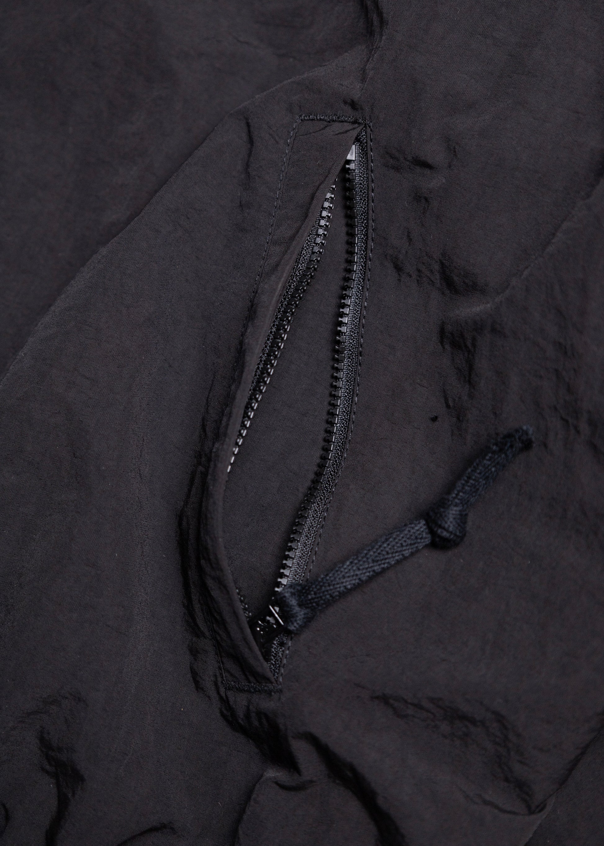 作業現場で雨の日などに着用する"ヤッケ" 本来は『上着』と言う意味があるのですが職人達が上物、パンツ関係なく雨具全般をヤッケと話していた事が印象的で製作に到りました。肩から袖口にかけて開閉されるジップが特徴的です。 素材はワッシャー感のあるヘビーナイロンツイルを使用しています。 マットな風合いでシルエットを際立たせるハリのある風合いが魅力です。
