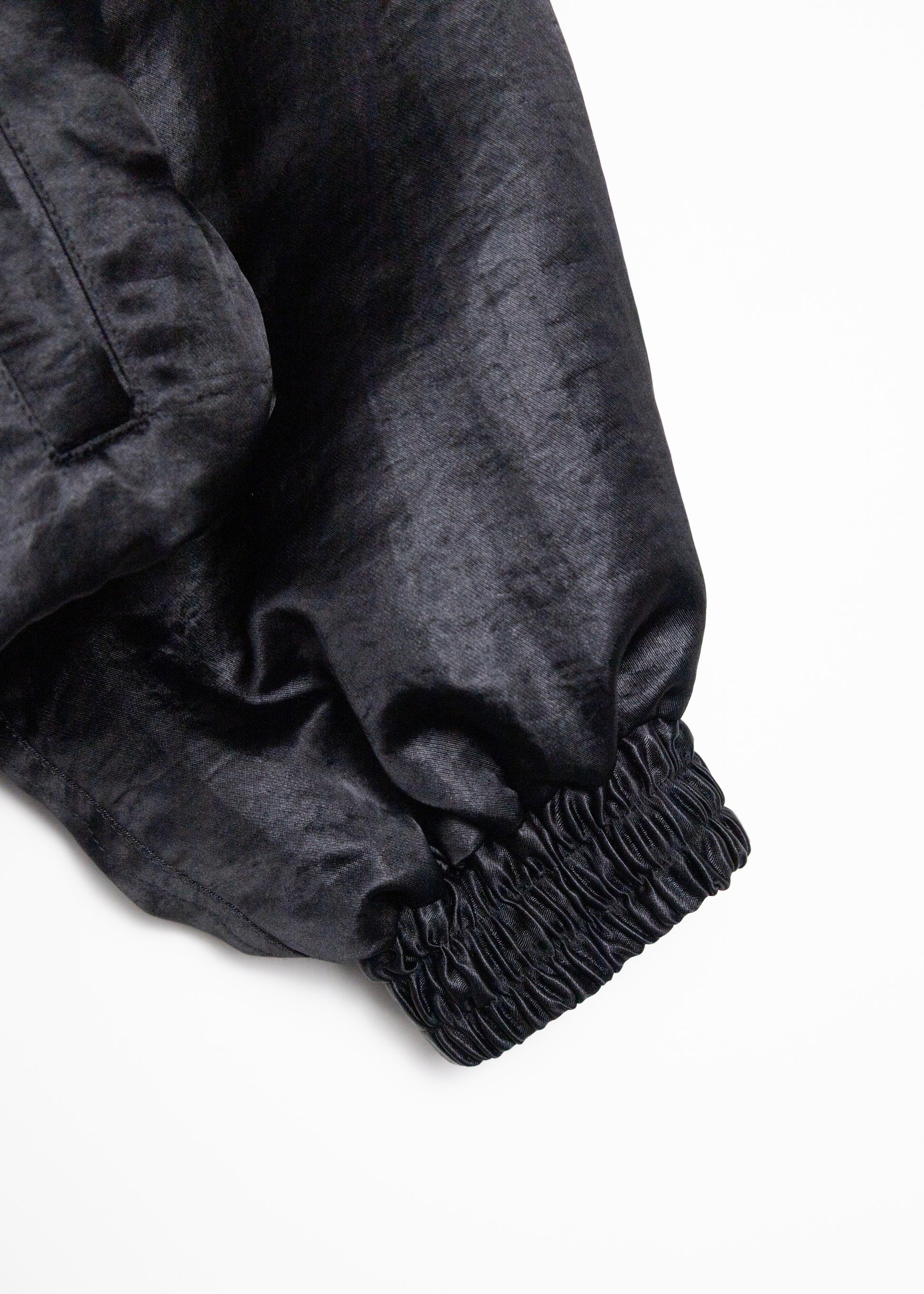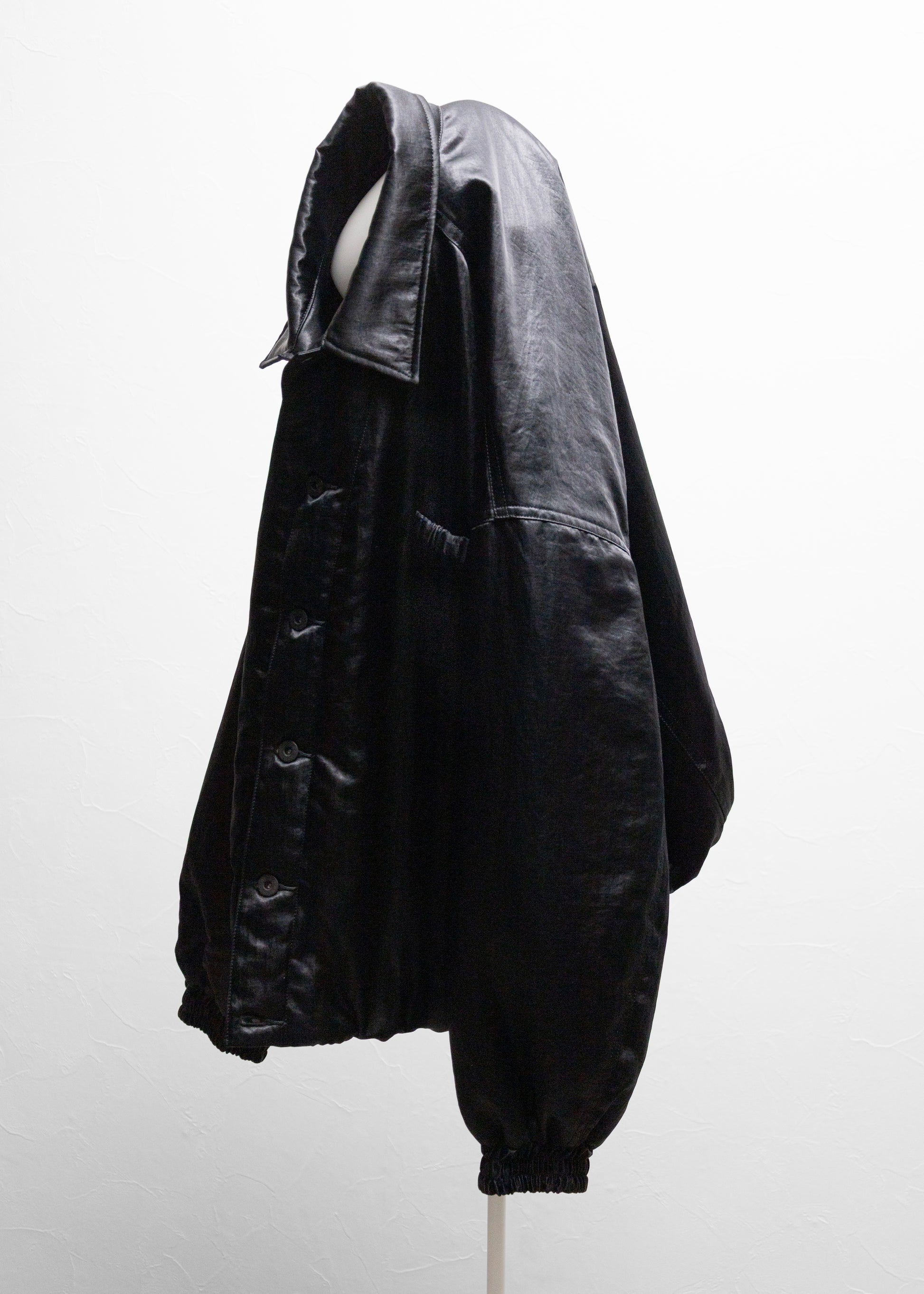 歴史的ワークウェアから各ディテールを取り除いた一着。 ナイロンサテンにコーティングを施し、タンブラー加工によってヴィンテージ感のある光沢を表現。左胸には、refomedの象徴ともいえるゴムディテールで表現したタグを配し、アイコニックなアクセントを加えている。