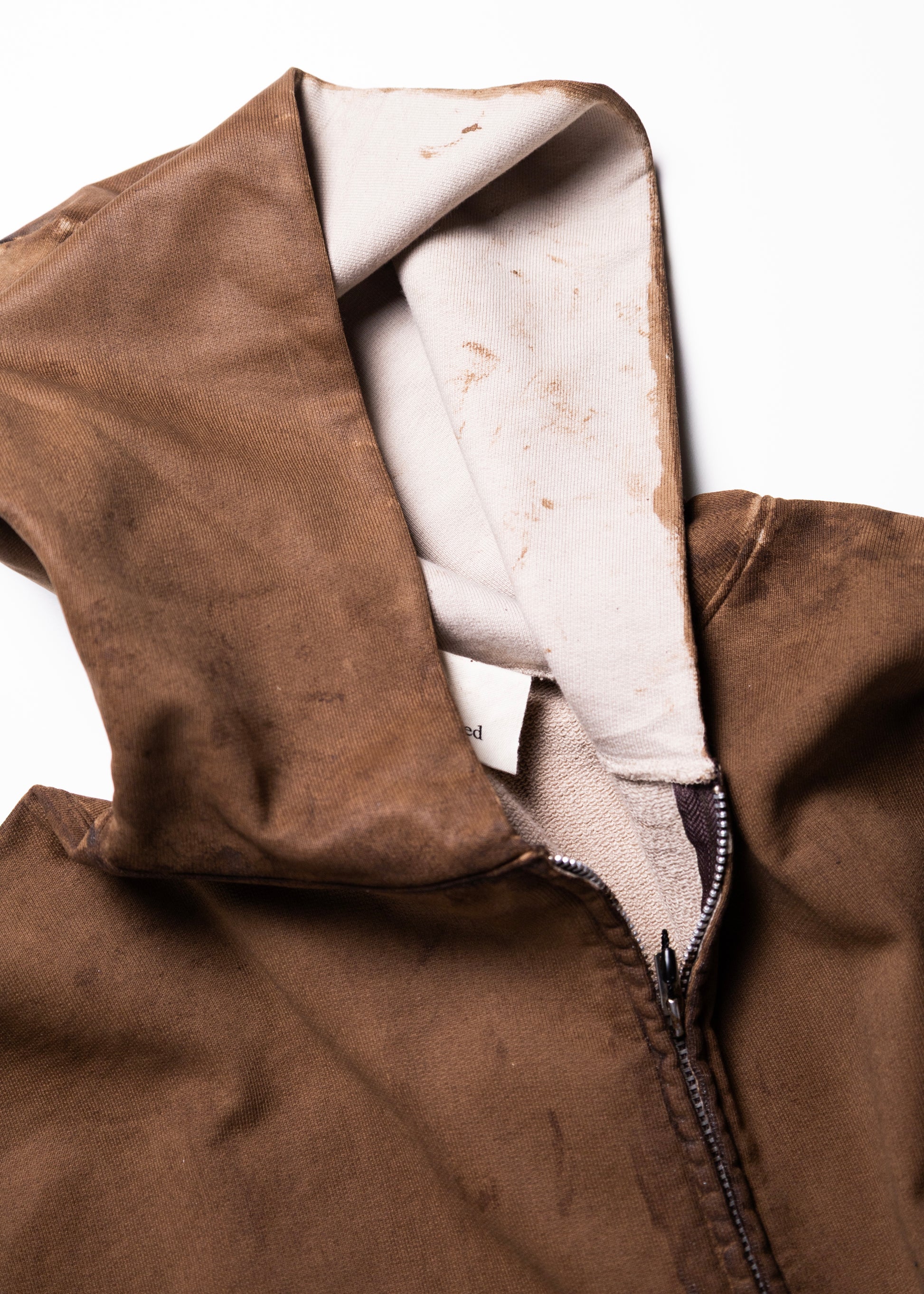 コーティング加工を施したジップアップフーディー。 左官の壁をイメージした顔料コーティング加工を施し、独特のムラ感と奥行きのある表情に仕上げた。着込むほどに質感が変化し、個々に異なる風合いが生まれる。