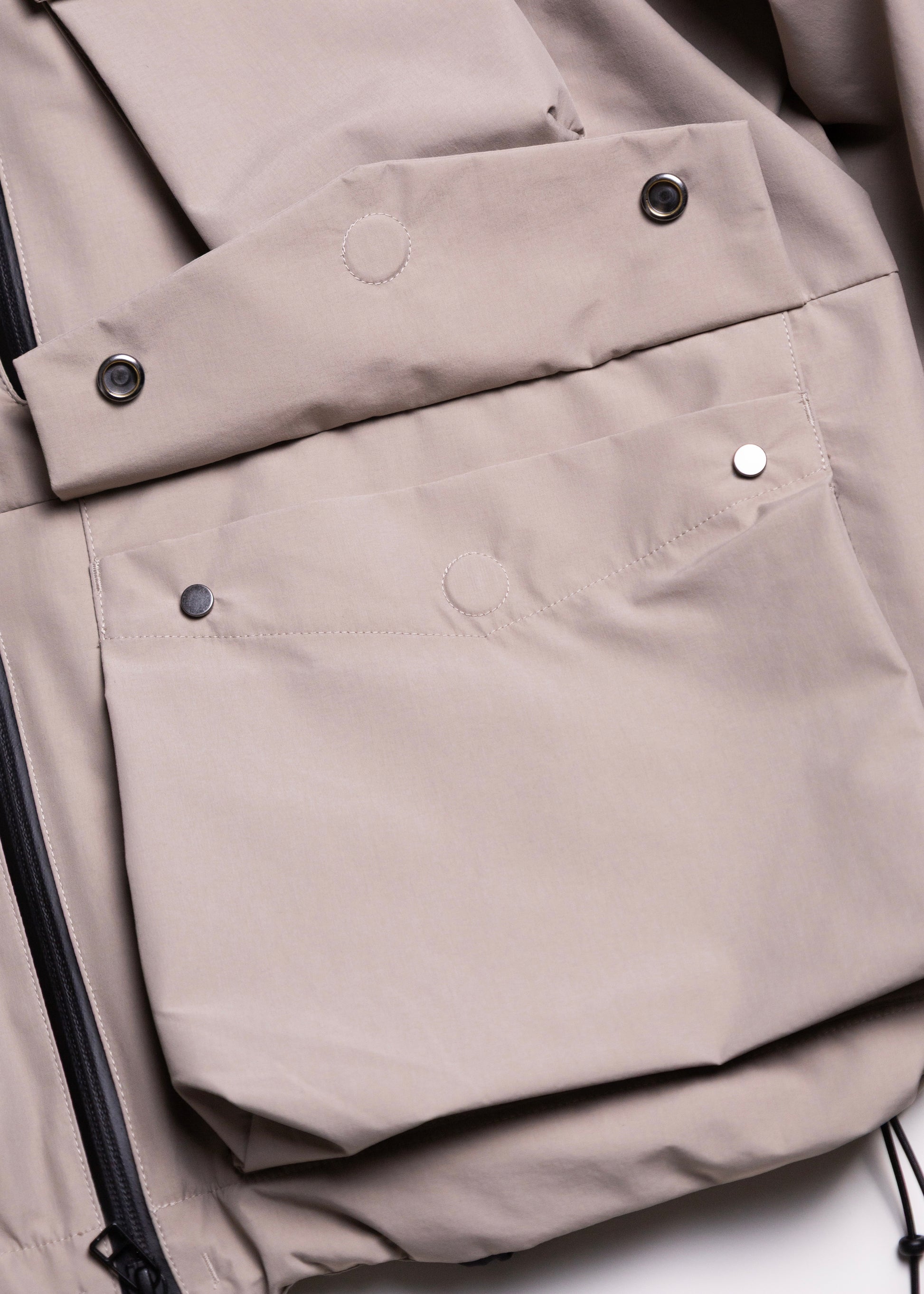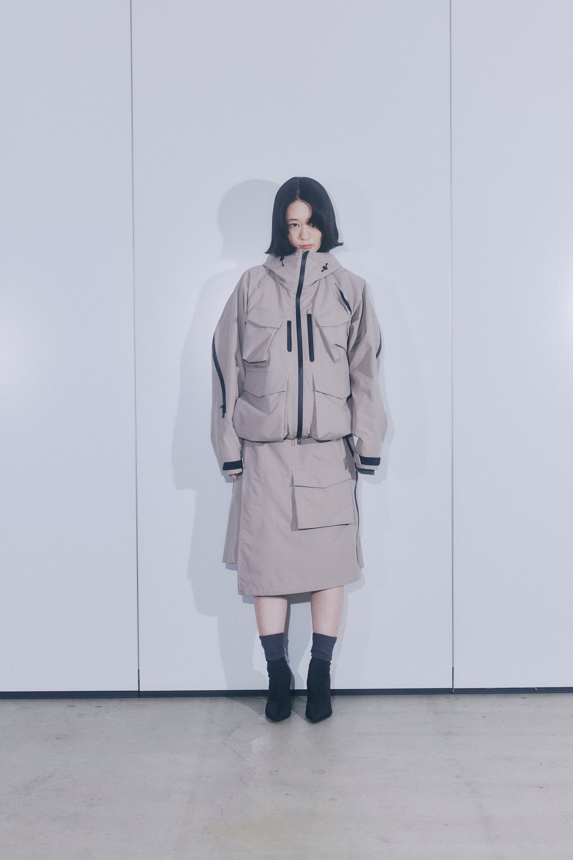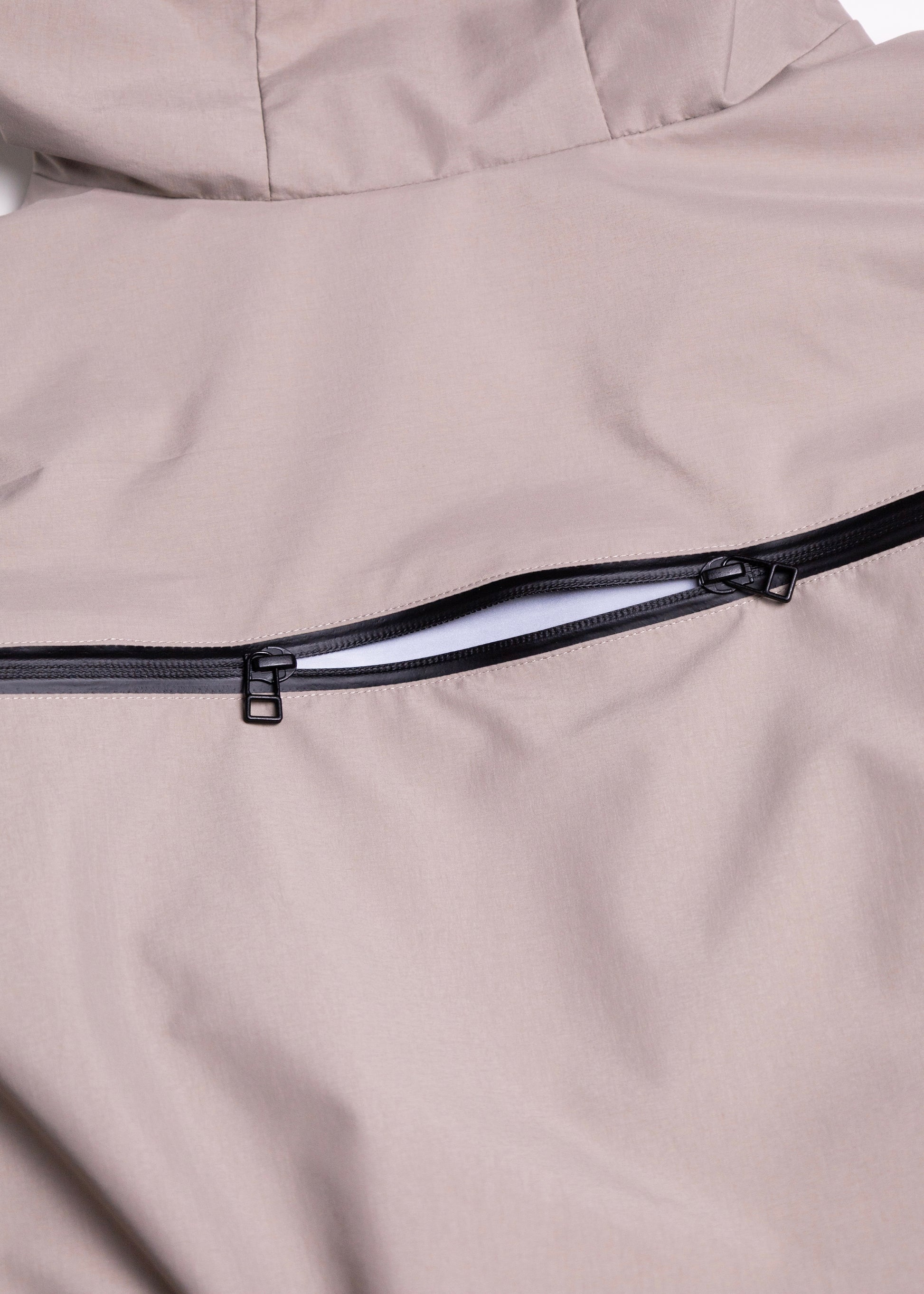 透湿防水機能に優れたナイロンを使用したシェルパーカ。フロントには止水ジップ、胸部にはベンチレーション用のジップを使用し、ディテールごとにパーツを使い分けている。背中にはシルエットを変化させるジップが配され、内側には反射素材を使用。フードはフィット感を高めるため、顔周りに二種類のドローコードを搭載。腰ポケットにはハンドウォーマー仕様とマグネットボタン仕様の用途によって使い分けられる2種のポケットを採用。袖口はベルクロ、内側には風よけ、裾にはシルエットを調節するためのドローコードを採用。
