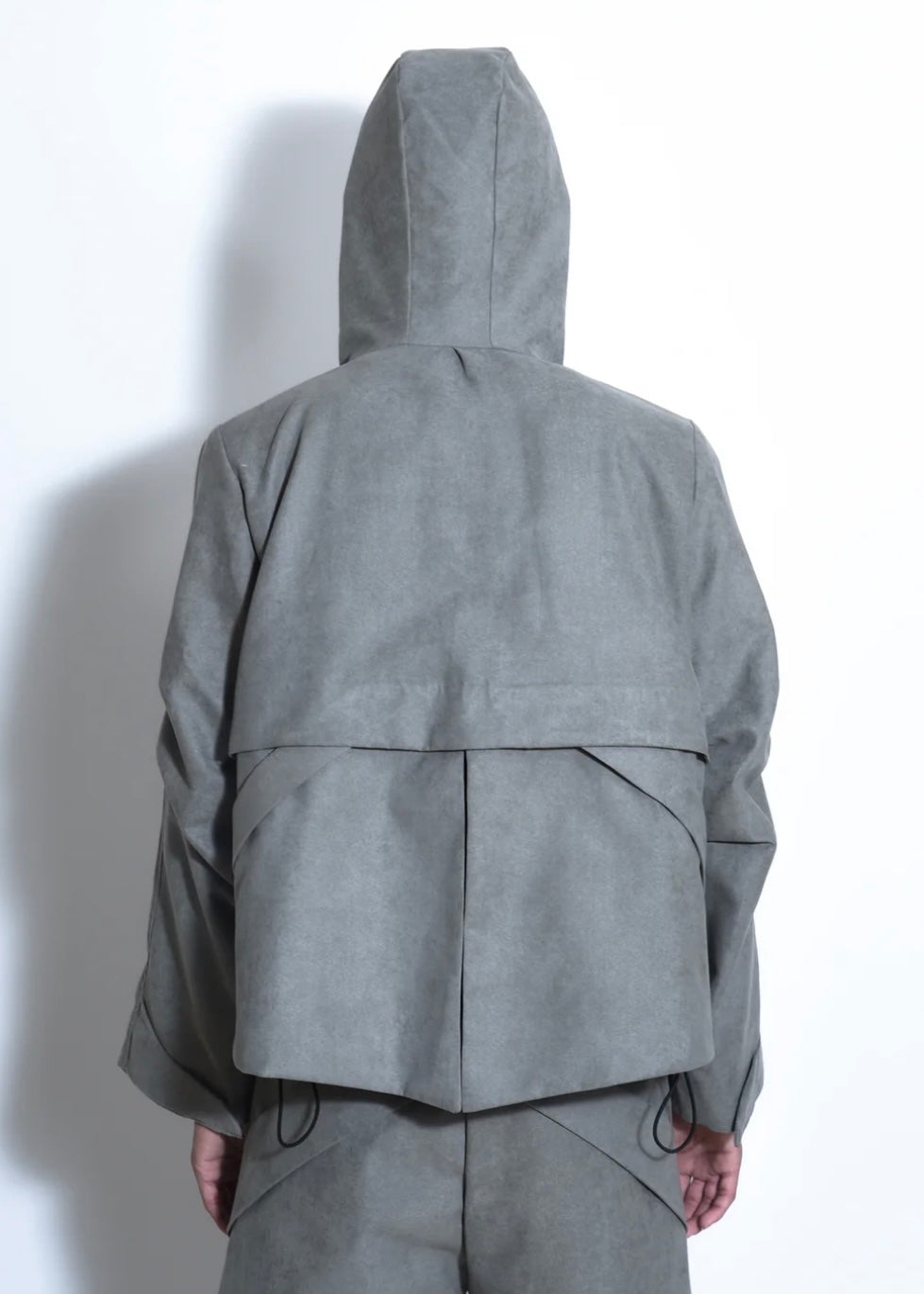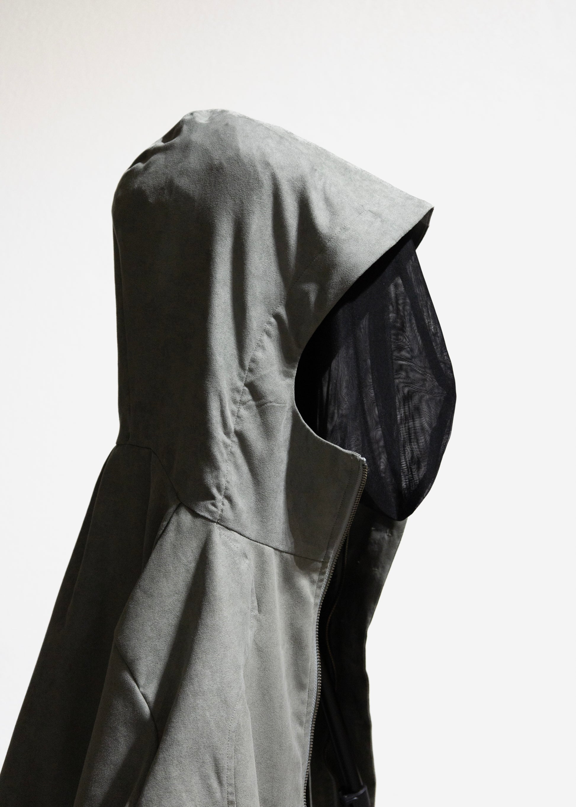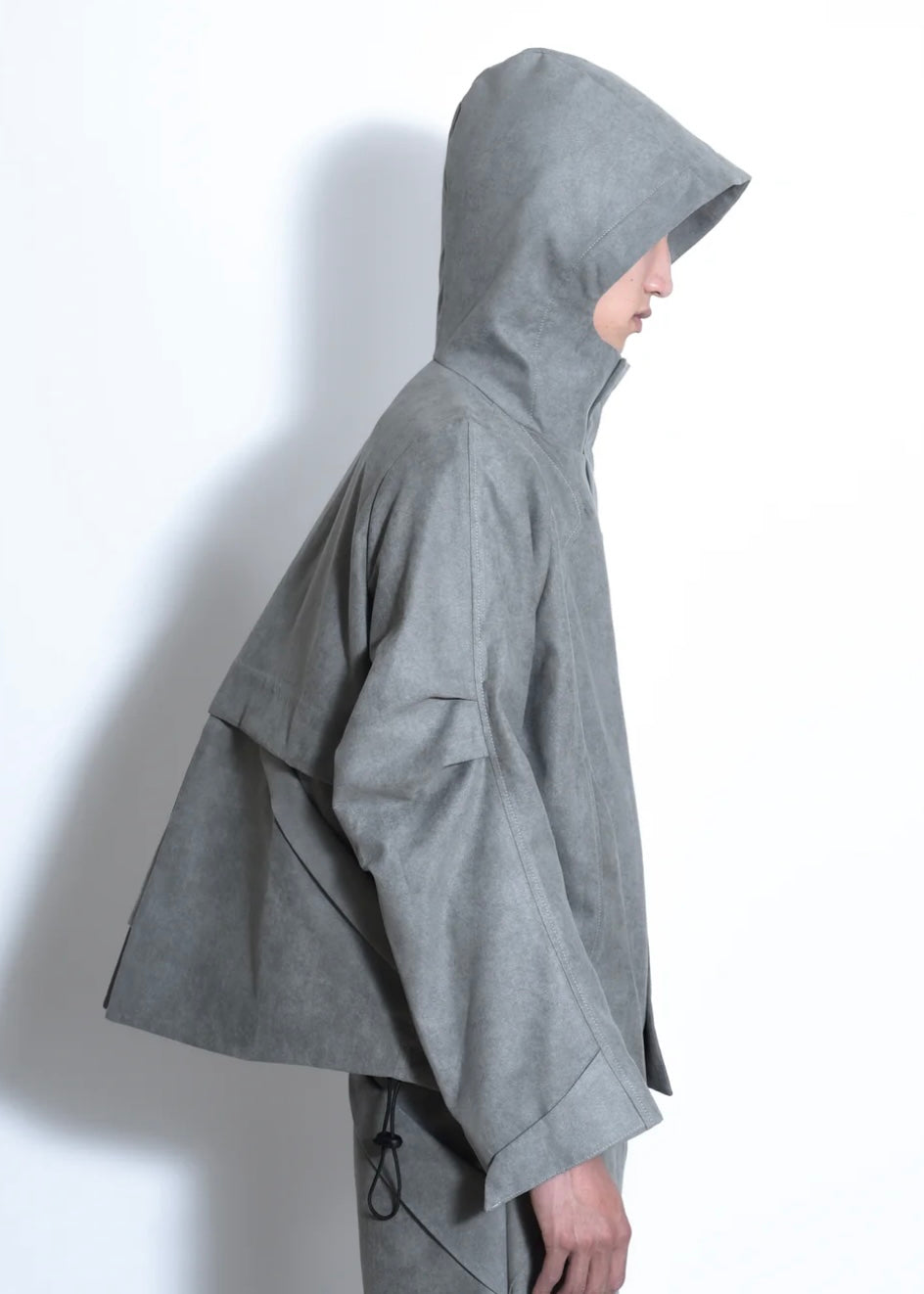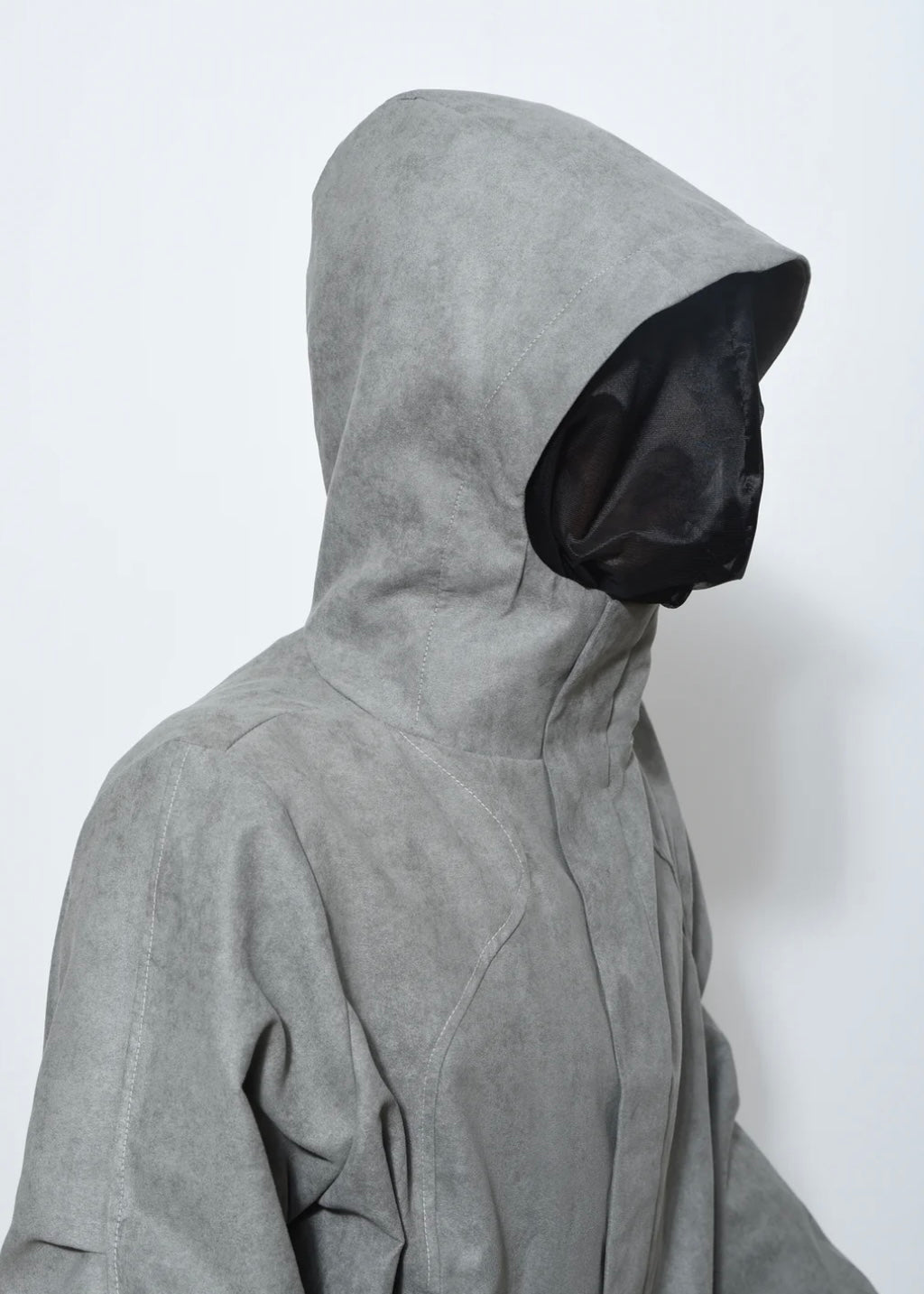 要所にマグネットボタンが使用されており、表裏が別れたフードは顔を覆う事が可能。