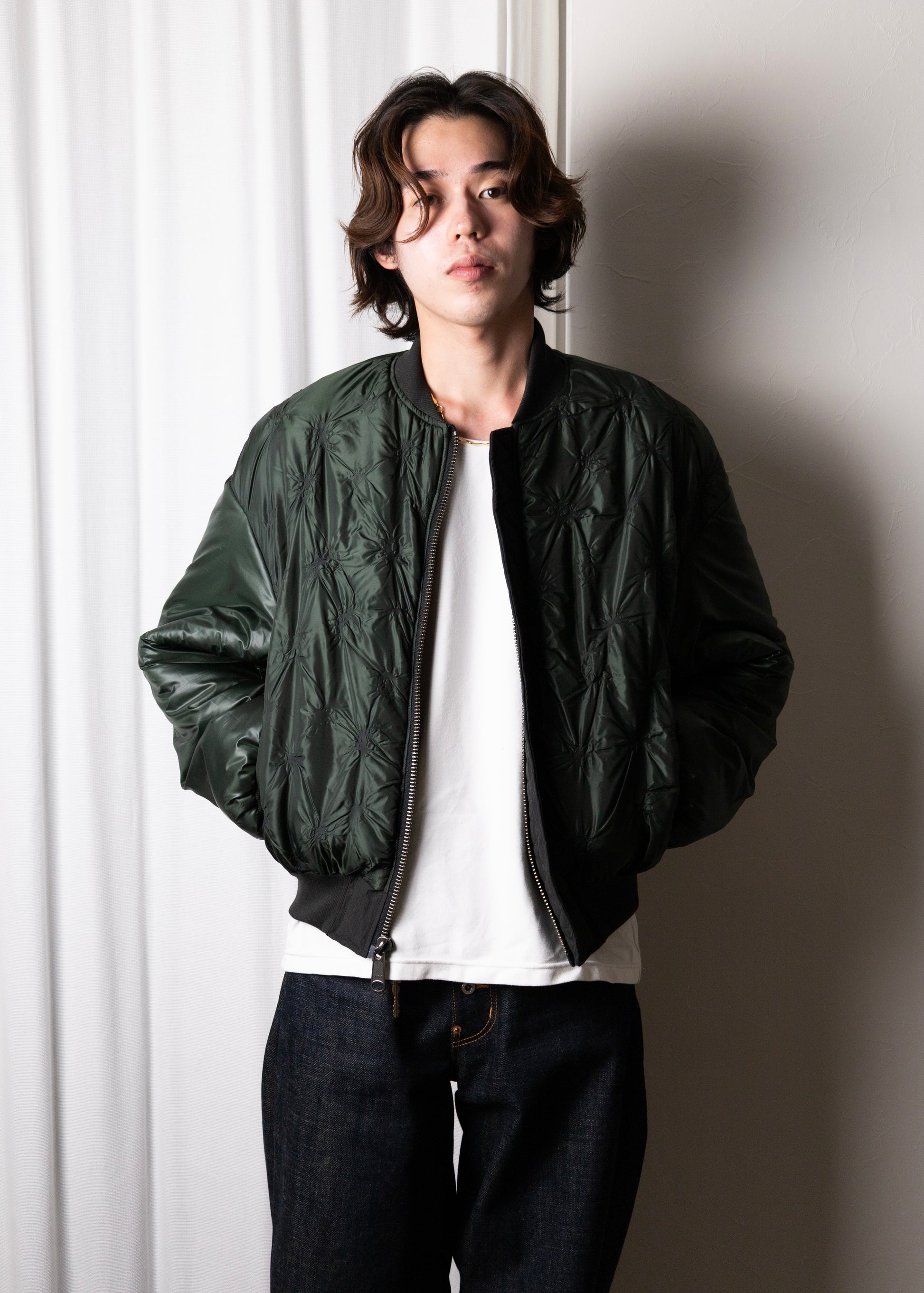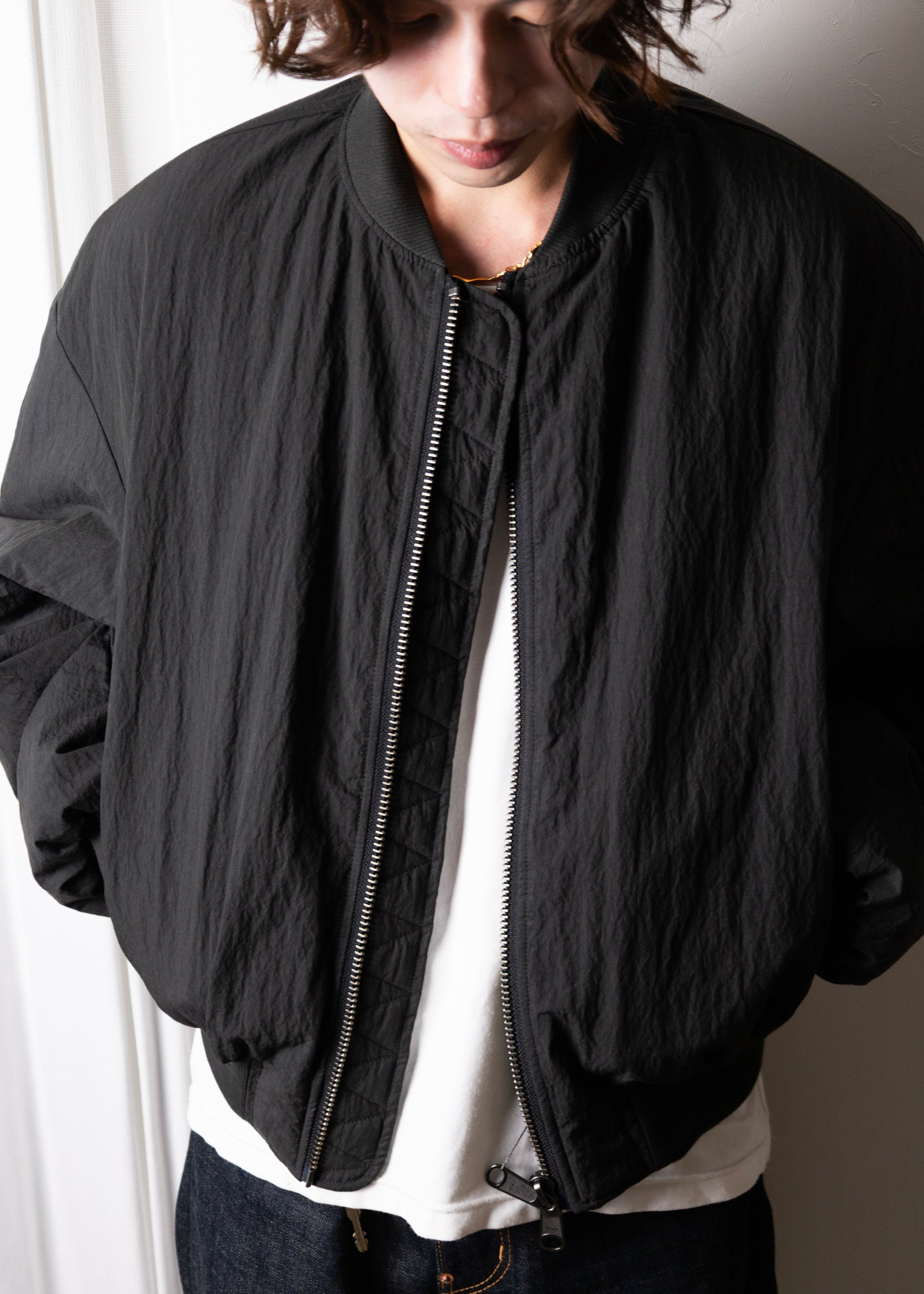これまでryawで作られてこなかったビッグシルエットのボンバージャケット。保温性とシルエットを保つ為に中綿は120g/mの綿を使用。カラー展開は行わず、素材違いでの展開となります。表面はミニマルな表情を反映し、裏地に脈加工を採用することで表裏で着用が可能なアイテムとなっております。