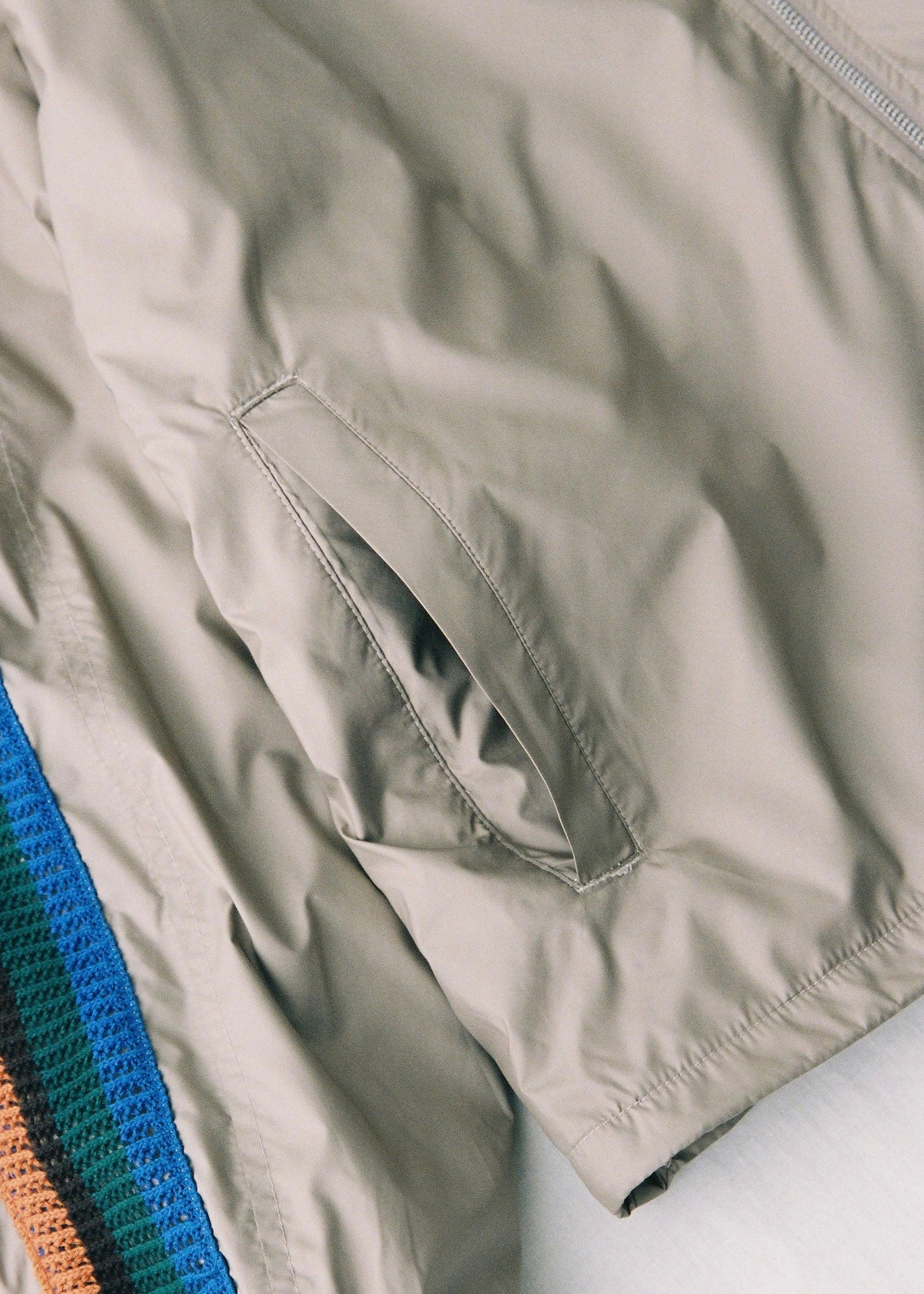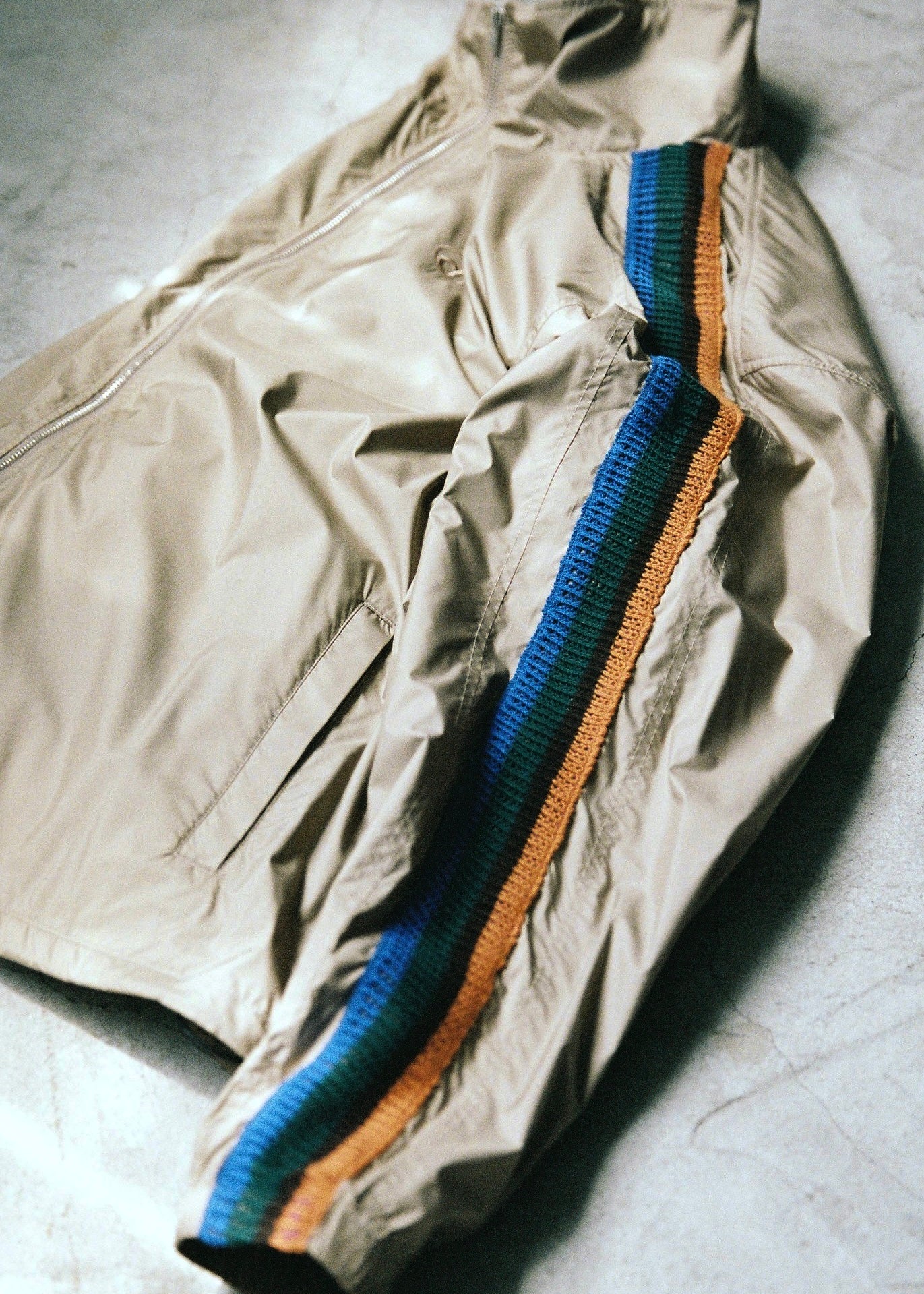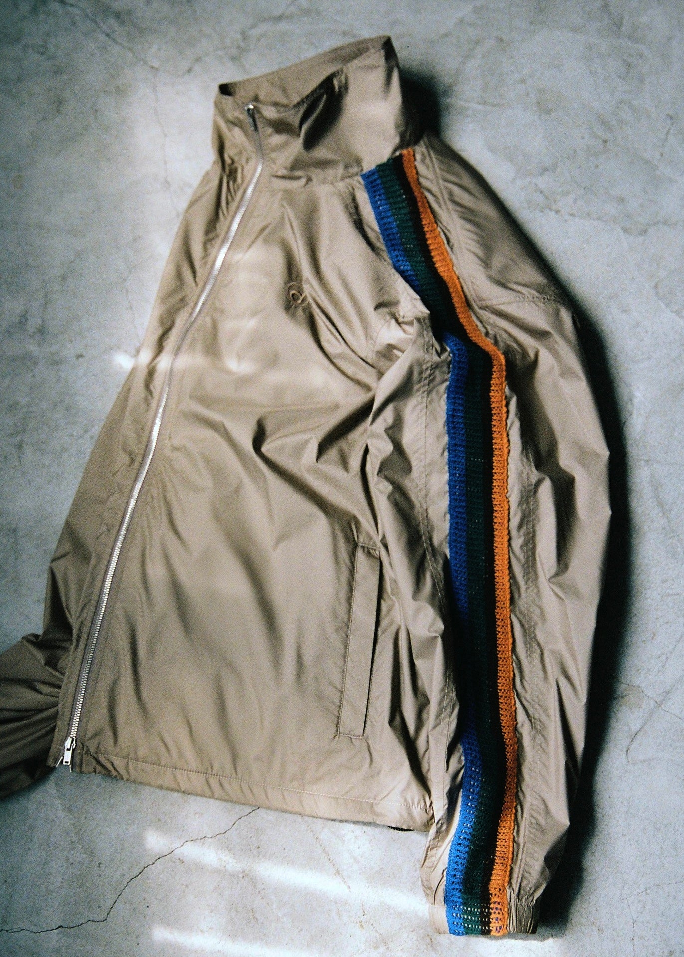 アイコン的なアイテムとなるトラックシリーズのポリエステルタイプ(ジャケット)。80〜90年代のウォームアップウエアから着想を得て、軽量なナイロン素材を⽤いることでなめらかな肌当たりと運動量が確保された丸みのあるシルエットが特徴。スピンドルによってサイズやシルエットの微調整も可能なため、幅広いスタイリングに落とし込むことができる。側章にはイギリスのサッカークラブから着想を得た配⾊をニットで配することで、ベーシックな中にもアクセントを持たせている。