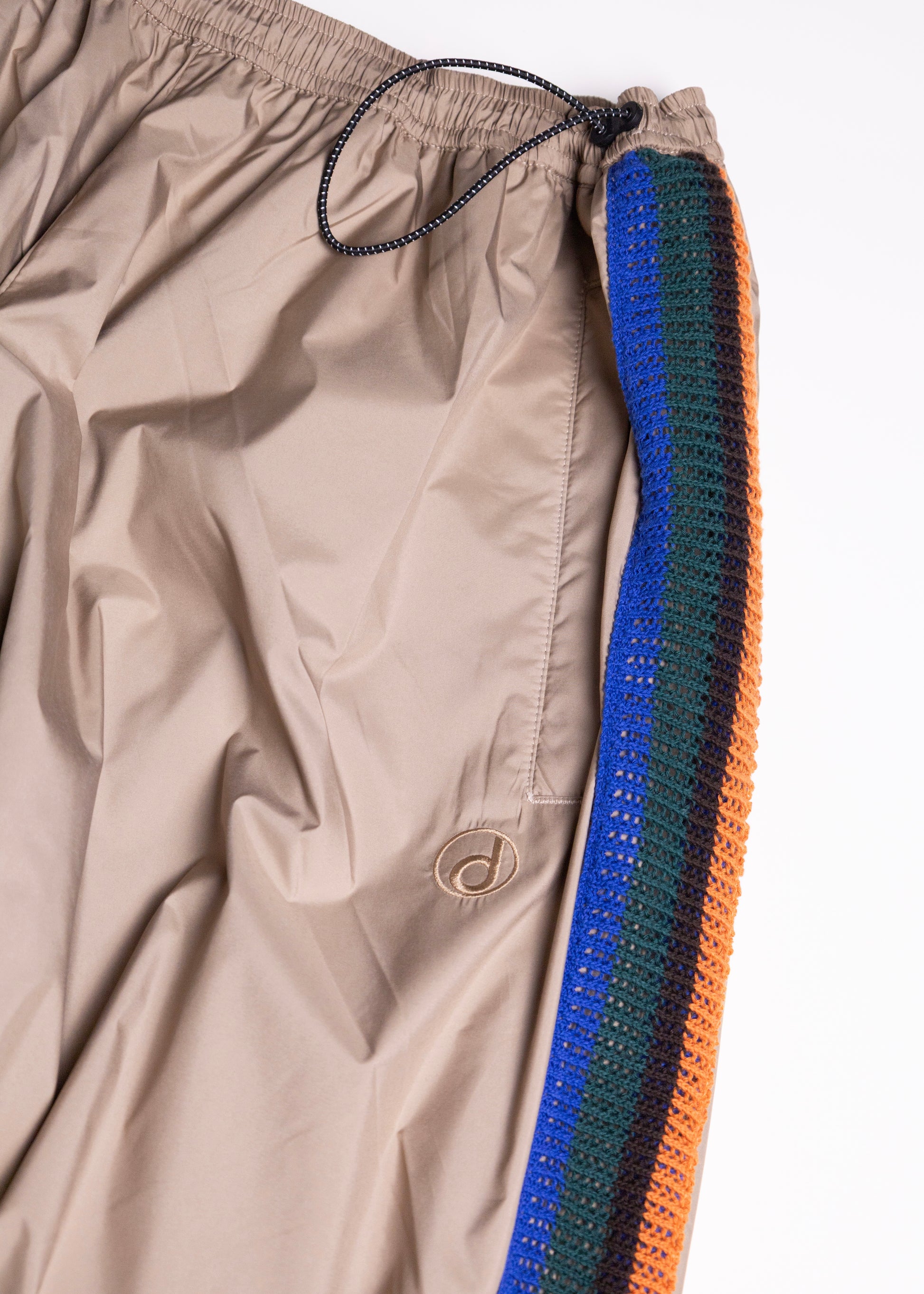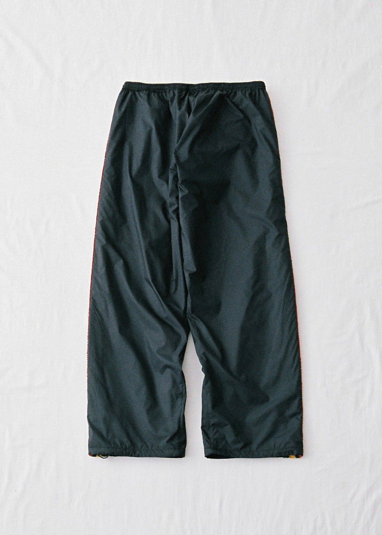アイコン的なアイテムとなるトラックシリーズのポリエステルタイプ(パンツ)。80〜90年代のウォームアップウエアから着想を得て、軽量なナイロン素材を⽤いることでなめらかな肌当たりと運動量が確保された丸みのあるシルエットが特徴。スピンドルによってサイズやシルエットの微調整も可能なため、幅広いスタイリングに落とし込むことができる。側章にはイギリスのサッカークラブから着想を得た配⾊をニットで配することで、ベーシックな中にもアクセントを持たせている。